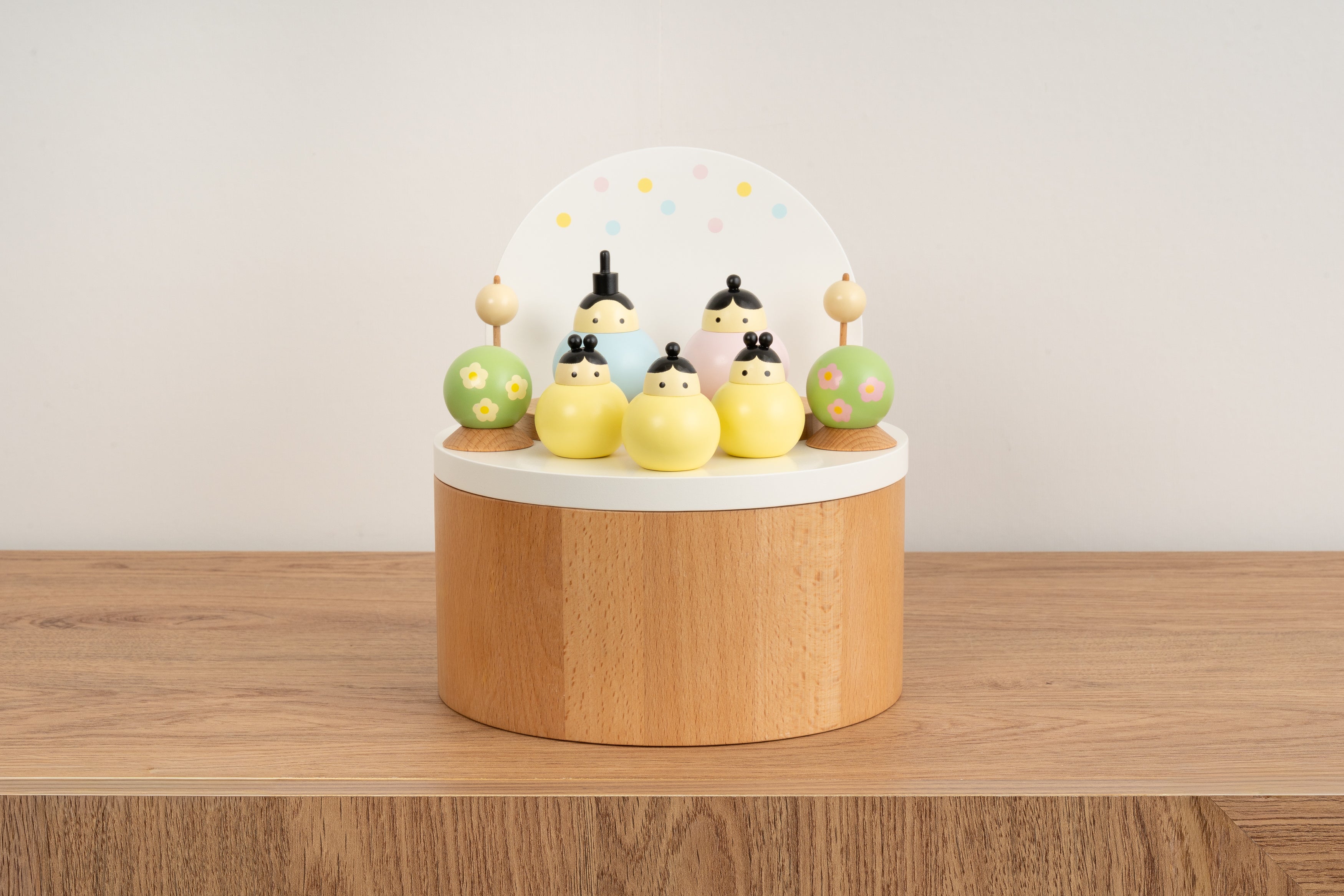 木のぬくもりを感じながら、ふれて、遊んで、飾って楽しめる。そんな、新しいひな祭りの楽しみ方をかたちにしました。収納箱と飾り台がひとつになっているので、飾るのも片づけるのもとても簡単です。