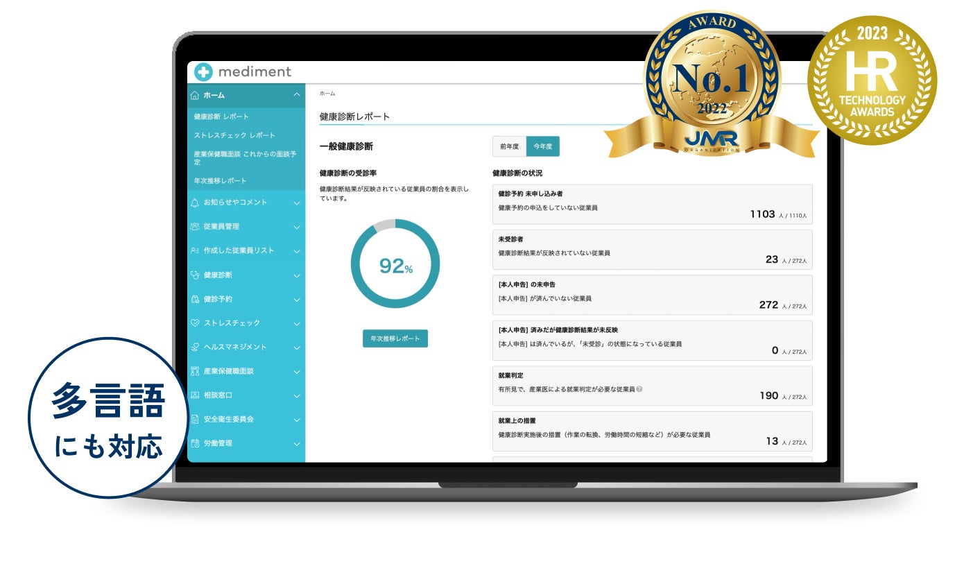 「mediment(メディメント)」は、健康経営や従業員の健康診断・ストレスチェック業務を担う人事労務担当者向けサービスです。