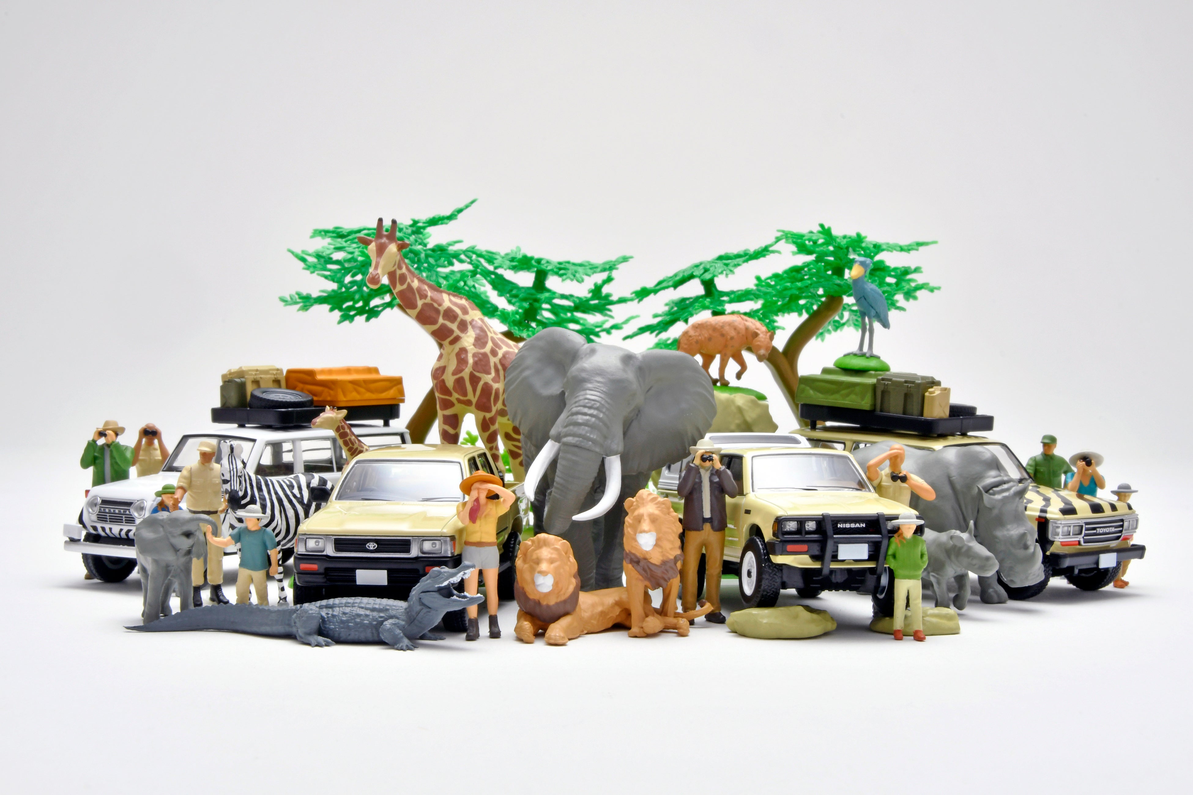 動物フィギュアは、「#カースナップ31a サファリ3」にはサイの親仔・ハシビロコウが、「#カースナップ32a サファリ4」にはライオン(座り・歩き)・ハイエナと全6種類付属します。海洋堂の1/35スケールプラスチックモデルキット「ARTPLA(アートプラ)」※2の造形データを基に、1/64サイズにリスケールしました。