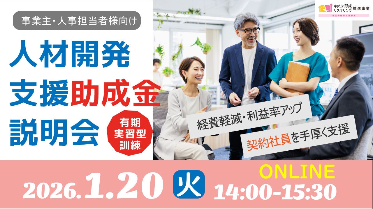 厚生労働省委託事業 キャリア形成・リスキリング推進事業は、企業・人事担当者様に向けてオンラインにて「人材開発支援助成金「有期実習型訓練」説明会」を開催いたします。