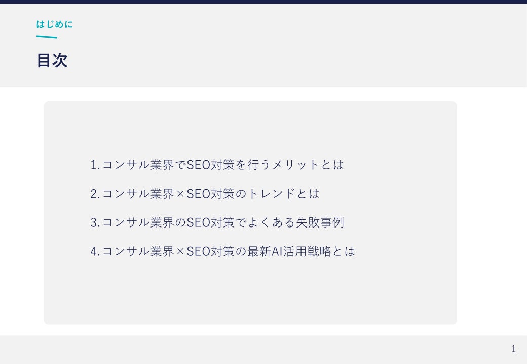 「2025年版 コンサル業界向けAI×SEOトレンドレポート」は、当社公式ウェブサイトより無料でご請求いただけます。この資料はAI化が進む現代において、コンサル業界でできるSEOでのAI活用法を徹底的に解説しています。