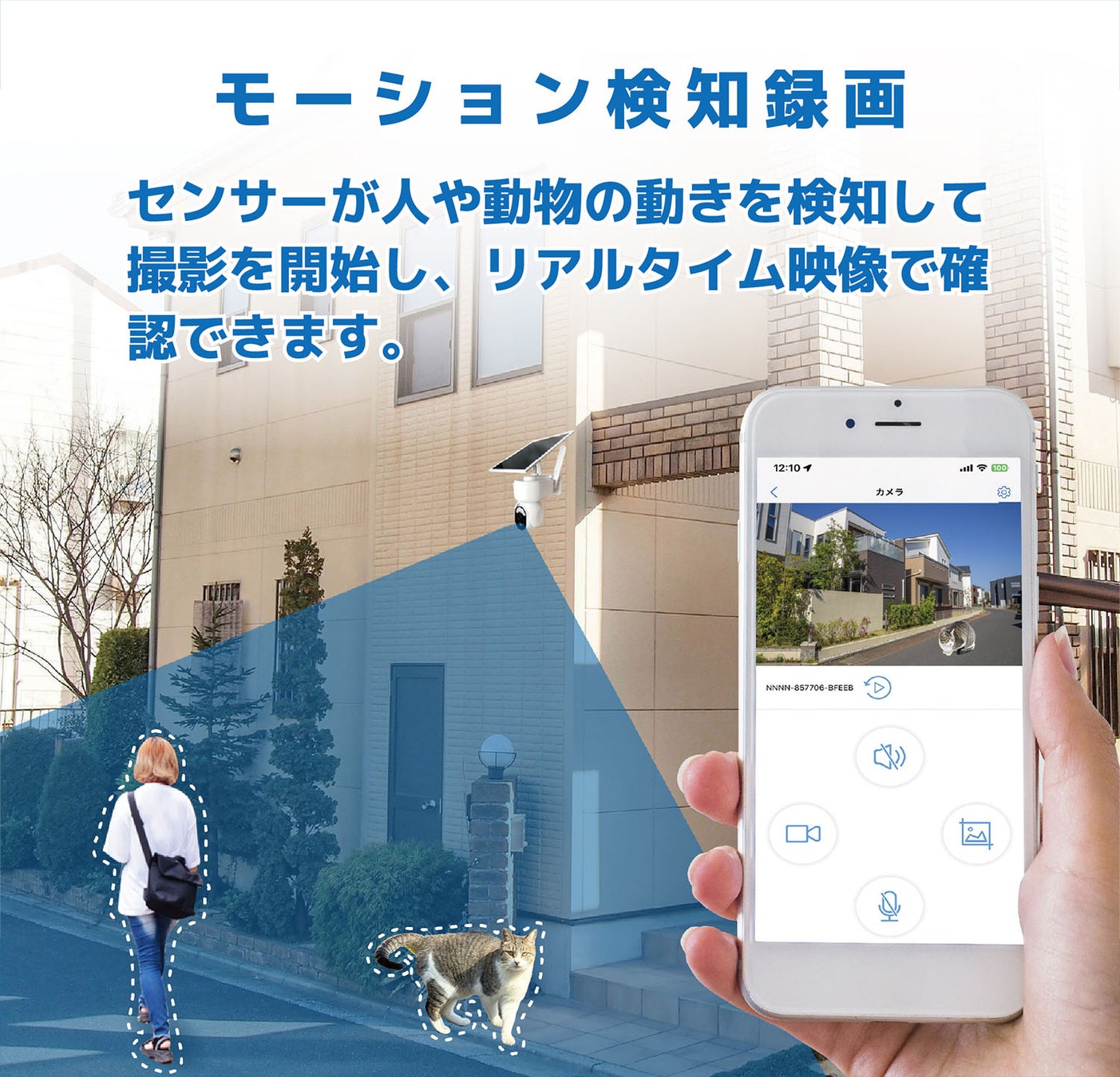 本製品はWi-Fi環境や電源工事が一切不要で、SIMカードを挿入するだけでスマホから遠隔地の映像を確認でき、動体検知時にLEDライトで威嚇・撮影を行うことで、犯罪の未然防止と安心な未来を創造します。