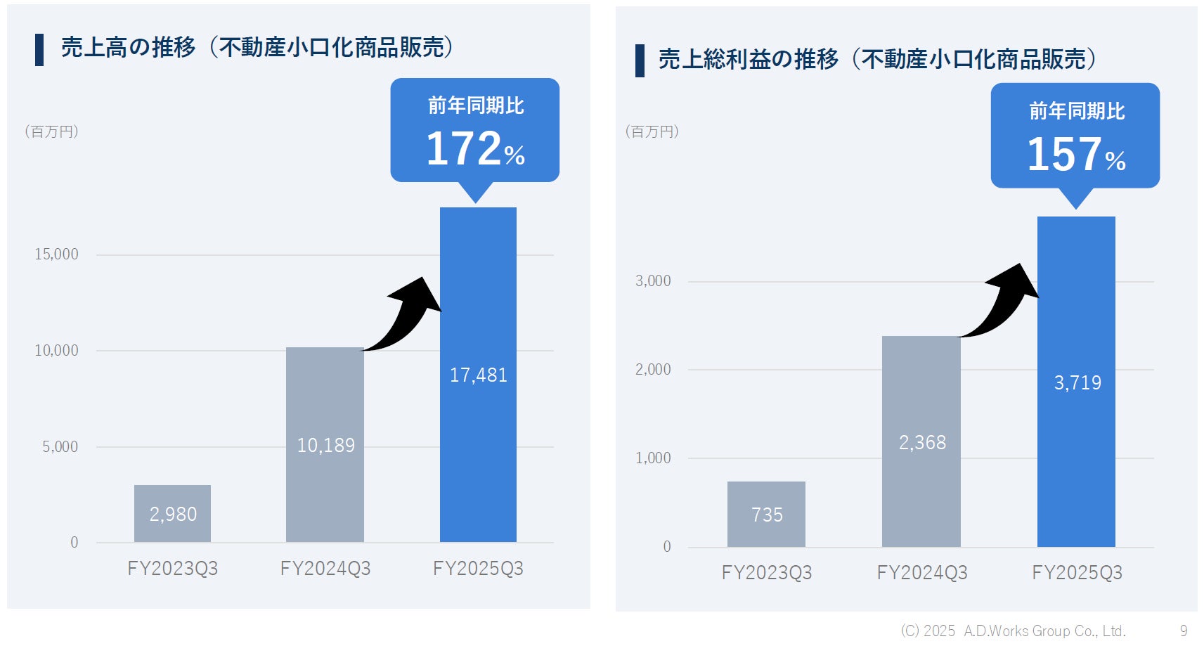 不動産小口化商品は、第3四半期で売上174億円(前年同期比172%)・売上総利益37.1億円(同157%)を達成しました。第3四半期単体では四半期販売額過去最高の67億円を達成しております。