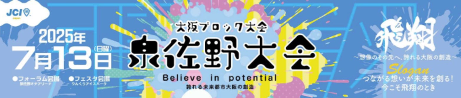「大阪ブロック大会 泉佐野大会」では、開催地である泉佐野市の魅力を中心に、大阪府下の地域資源の価値や魅力を広く発信します。また、地域間の垣根を越えた交流や、参加メンバー同士の連携を深めることによって、地域に好循環を生み出し、誇れる大阪の未来づくりに寄与していきます。 この大会を通じて、28地域の青年会議所が一堂に会し、それぞれの地域の魅力を分かち合い、新たな発見や刺激を得ることで、メンバー一人ひとりが自らの可能性を信じ、変化や失敗を恐れず前向きに挑戦を重ねていく。そのような姿を「飛翔」に重ね、2025年度大阪ブロック大会泉佐野大会のテーマを 『飛翔 ~想像のその先へ、誇れる大阪の創造~』といたしました。