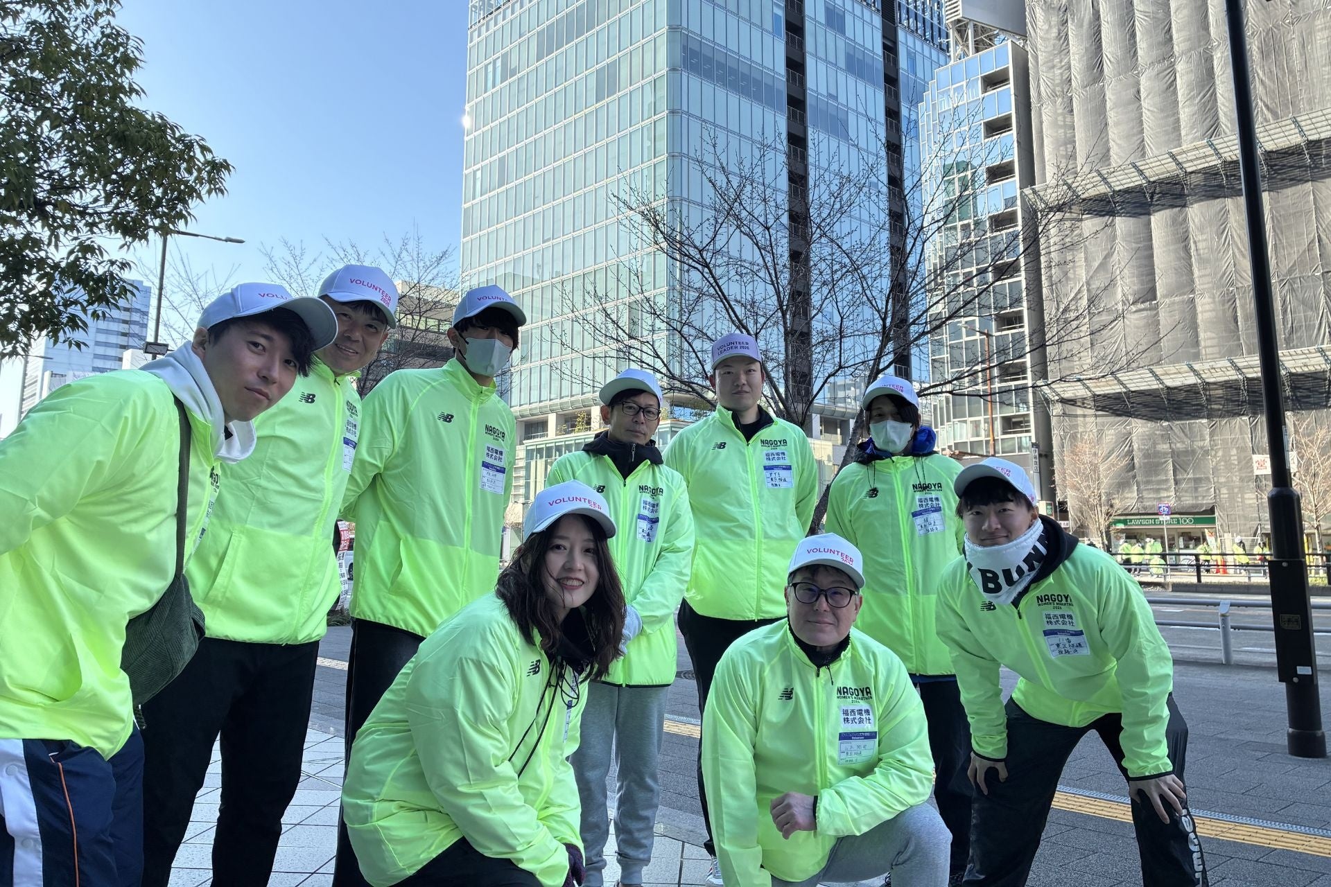 本大会のボランティアスローガン「つなげよう、やさしさのバトンを」への賛同を背景に、福西電機は地域と企業をつなぐ「架け橋」となることを目指して本活動に取り組みました。コース整理・誘導などを通じて、ランナーの安全確保と大会運営の円滑化をサポートするとともに、参加者一人ひとりがパーパスと本活動のつながりを考える機会となるよう心掛けました。