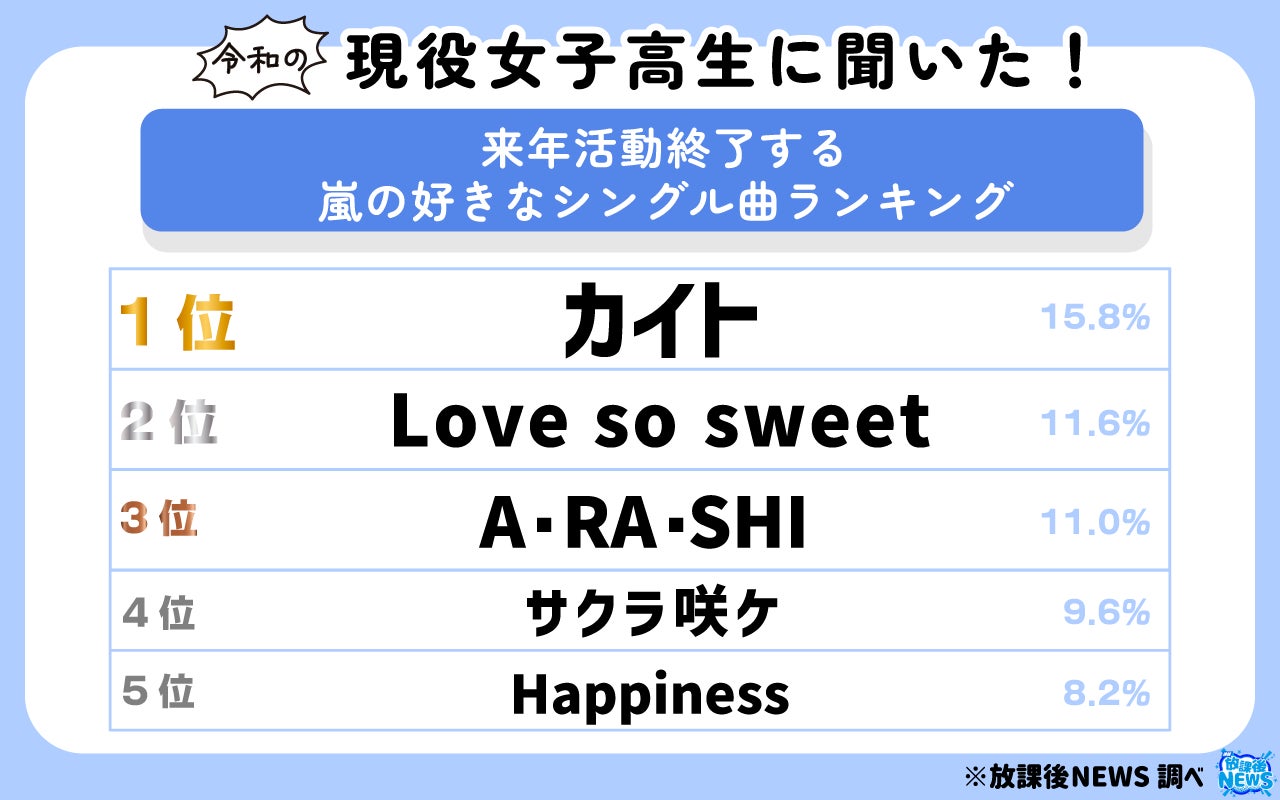 現役女子高生を対象に「来年活動終了する嵐の好きなシングル曲は何か」というアンケート調査を実施