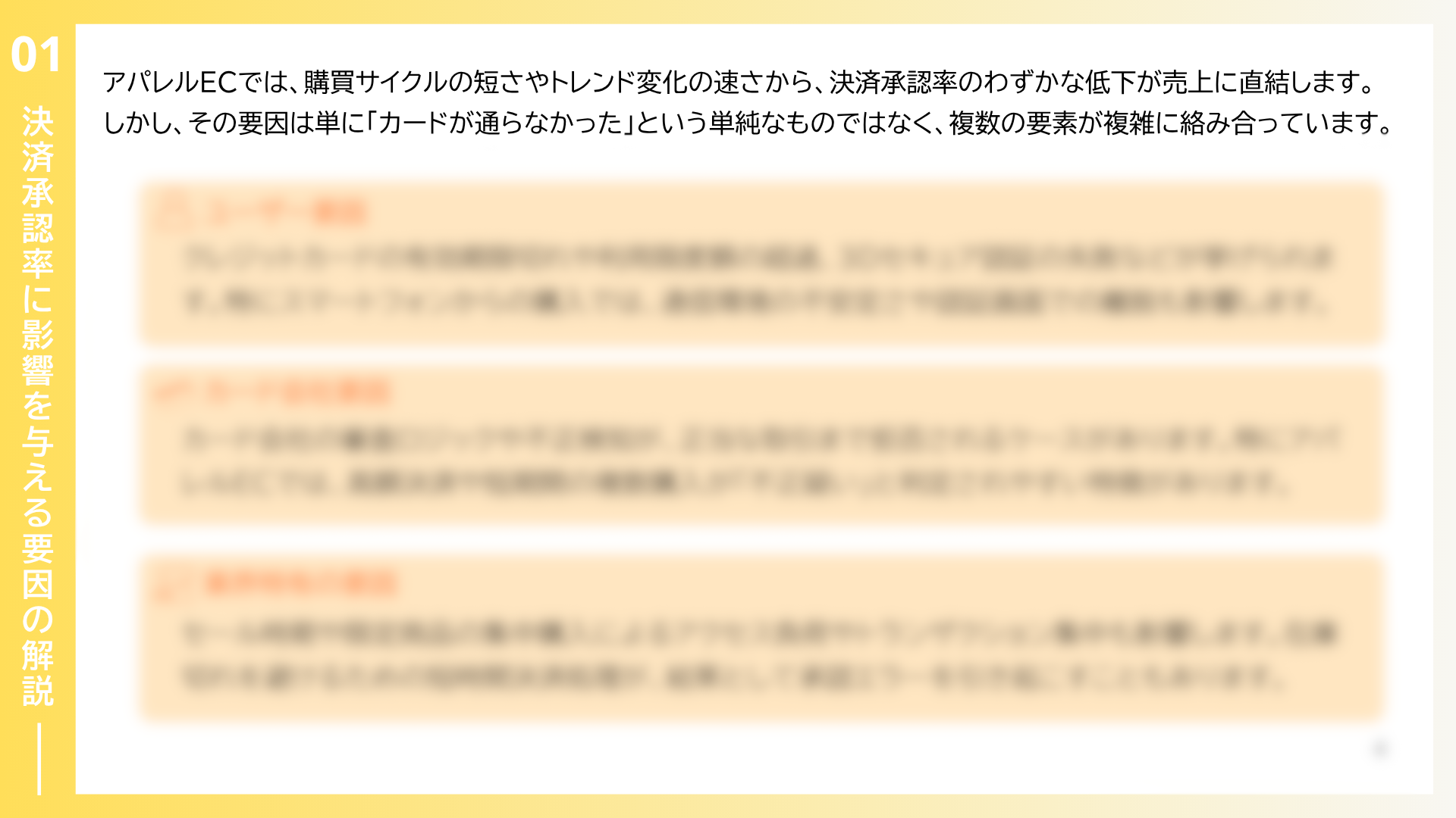 本レポートでは、アパレルECにおける決済リスクを多角的に分析しています。具体的には、決済承認率に影響を与える主な要因の解説に加え、実際に発生した不正手口と被害事例の整理、さらにアパレルEC特有の狙われやすい商品カテゴリの傾向を取り上げ、業界特有のリスク構造と改善の方向性を明らかにしています。