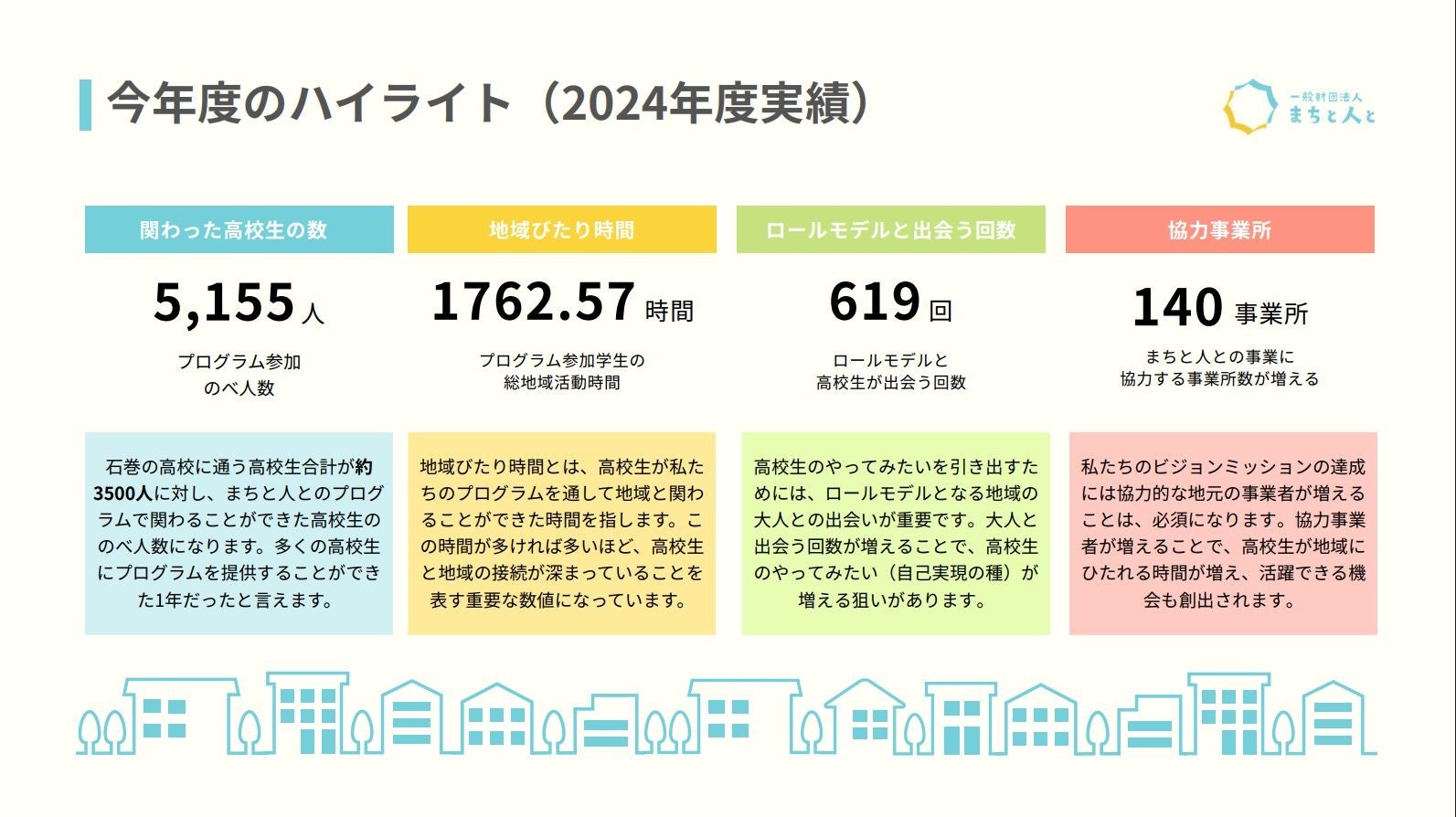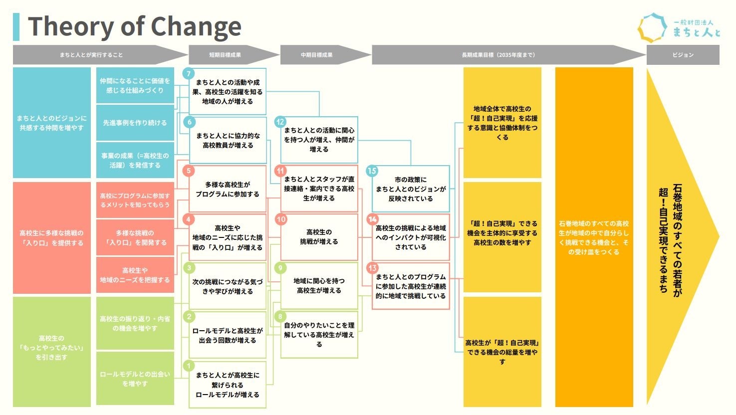 一般財団法人まちと人とは、2035年までに、宮城県石巻地域のすべての高校生に、経済状況や家庭環境に左右されず、地域の中で多様な他者と出会い、自分らしく挑戦できる機会を提供します 。私たちは、若者の「やってみたい!」を地域全体で応援し、「まちが人を育み、人がまちを豊かにする」好循環を生み出します 。