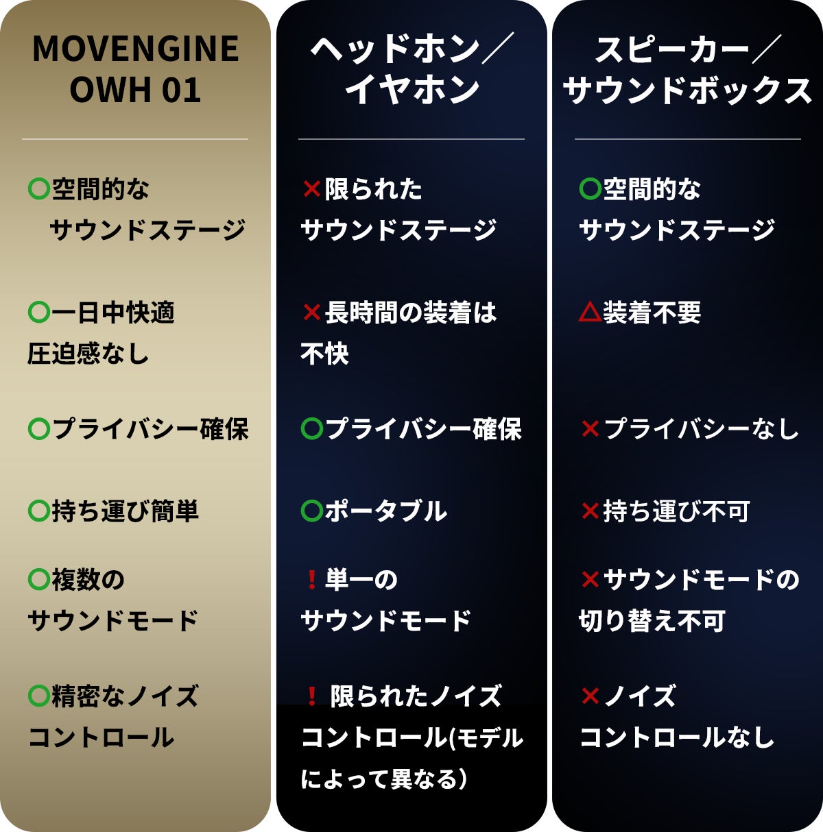 自然な開放感と遮音性、どちらを選ぶか迷う必要はありません。Movengine AirCore™ 「OWH 01」なら、環境に応じて「オープンモード」と「シールドモード」を切り替えることができます。