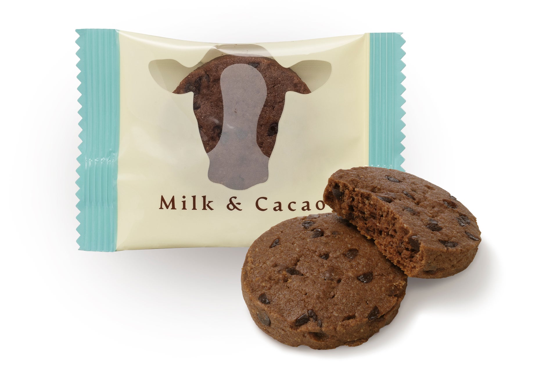 カカオ感の強いココア生地のクッキーに、スイートチョコレートのチョコチップを合わせました。生地に北海道産牛乳を使用した、カカオとミルクの味わい。