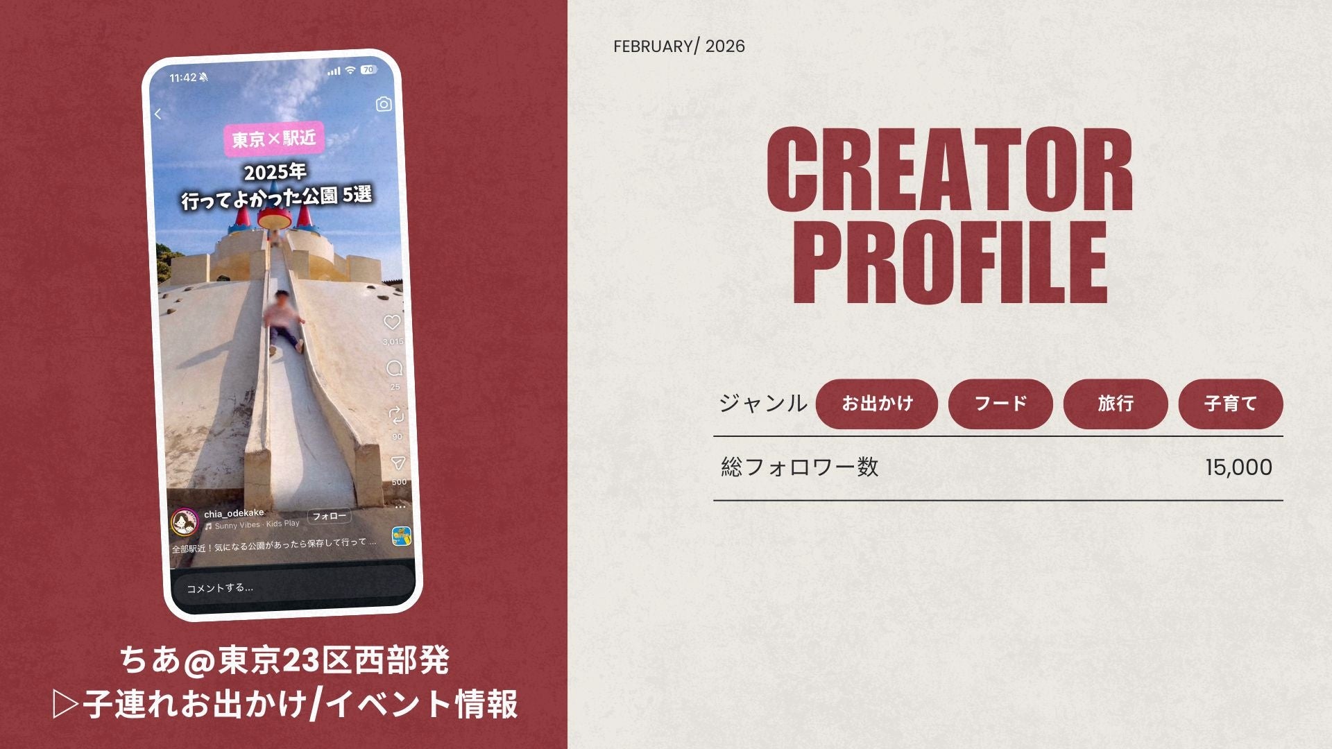 「ちあ@東京23区西部発▷子連れお出かけ/イベント情報」は、子どもが楽しめるお出かけスポットを中心に取材を行い、動画の制作・発信をしています。これまでの投稿の中には、再生回数62万回を超える動画も。子育て分野に強みを持つ同メディアの加盟により、子育て関連の新商品・スポットなどの認知拡大が期待できます。