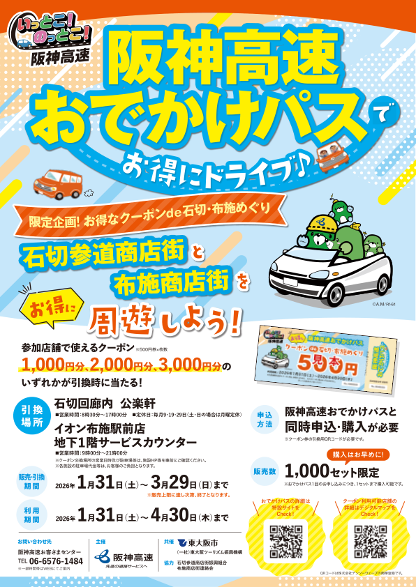 阪神高速道路株式会社(本社:大阪市北区、社長:上松英司)は、東大阪市及び一般社団法人東大阪ツーリズム振興機構と共催し、石切参道商店街・布施商店街と連携した限定企画「お得なクーポンde石切・布施めぐり」を、阪神高速おでかけパスの観光施設セットプラン内で販売します。歴史情緒あふれる「石切」と、活気あふれる商人の街「布施」。お得な阪神高速おでかけパスと商店街の対象店舗で使用できるクーポン券で、東大阪のディープな魅力を発見するドライブへ出かけませんか?