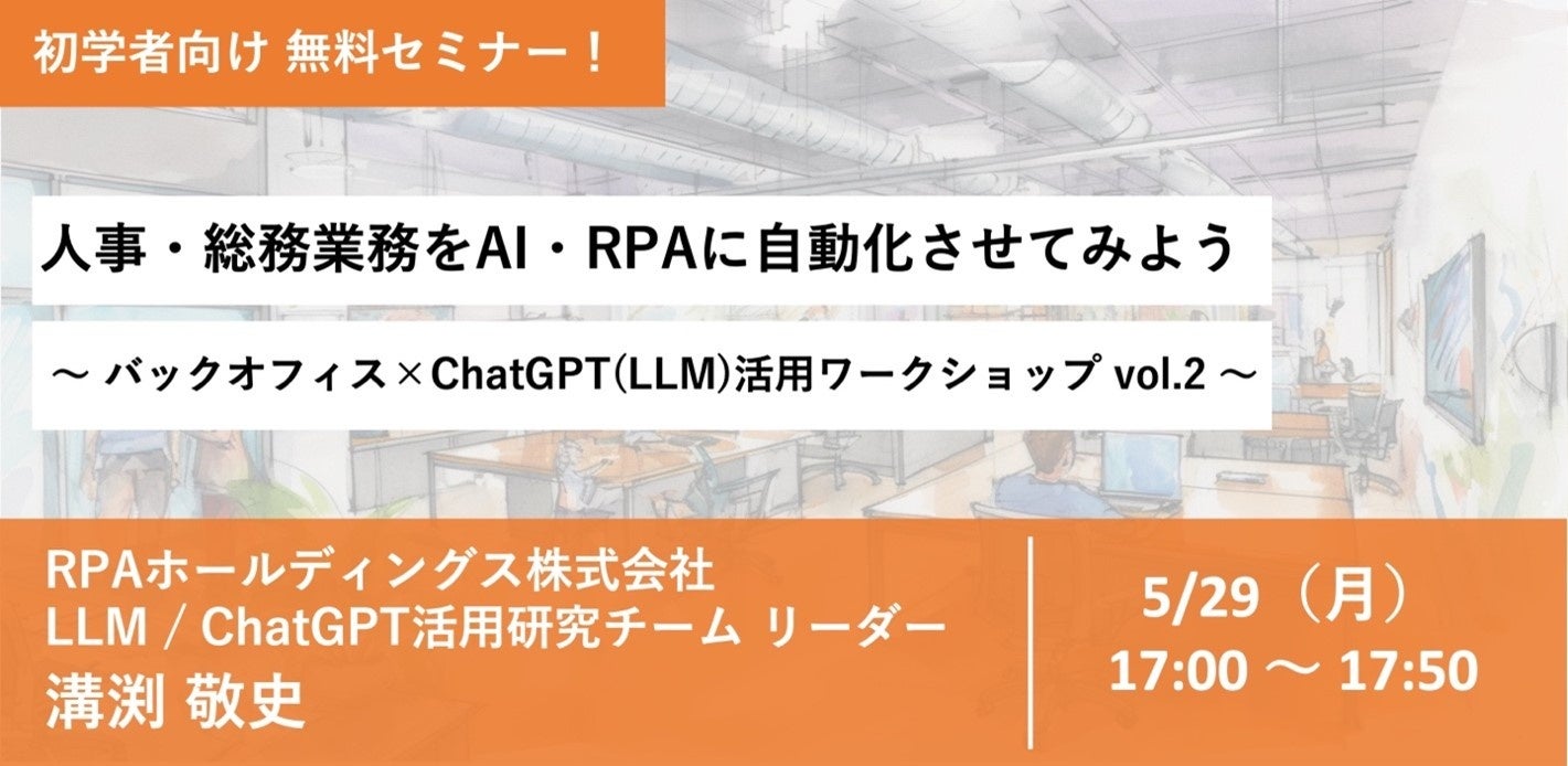 RPAホールディングス(本社:東京都港区、代表取締役:高橋 知道、以下「RPAホールディングス」)は、無料のオンラインセミナー「人事・総務業務をAI・RPAに自動化させてみよう〜バックオフィス×ChatGPTワークショップ vol.2〜」を開催致します。