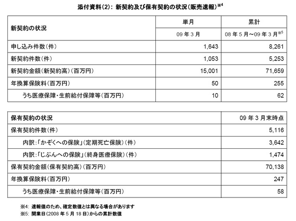 ライフネット生命保険 2009年3月の販売速報
