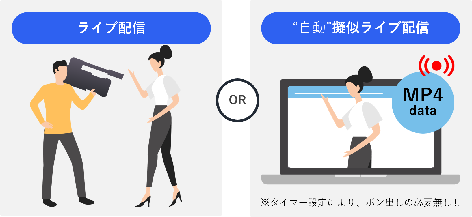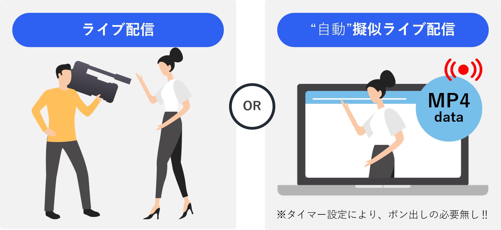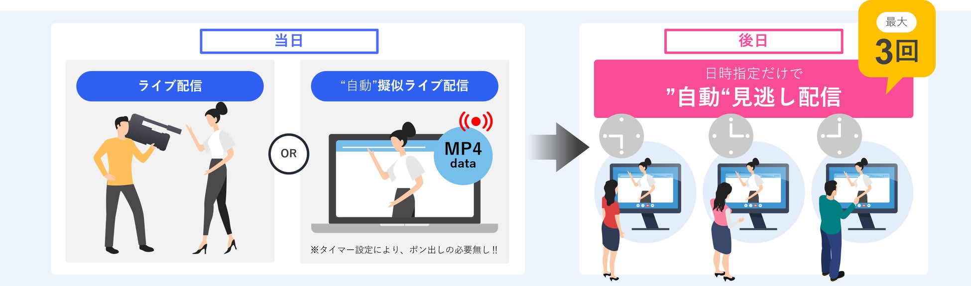 ライブ配信を配信した後、その配信を自動で動画化して事前に指定した時刻に見逃し配信をおこなうことができます。配信したい日時の設定だけで楽に配信が可能となり、配信後に動画をアップロードし直す手間や次の配信までの時間に追われることが無くなります。