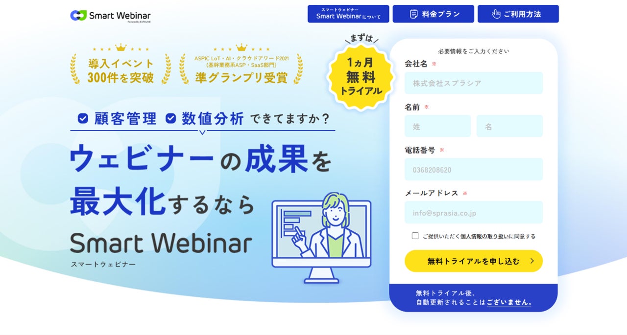 イベントDXを推進する株式会社スプラシア(本社:東京都中央区、代表:中島 優太)は、2023年4月10日(月)に成果の出るウェビナー管理ツール「Smart webinar」をリリースいたしました。リリースの記念として初期費用無料、1ヵ月利用料無料キャンペーンを実施中です。無料の初回トライアルもございますので是非お声がけください。