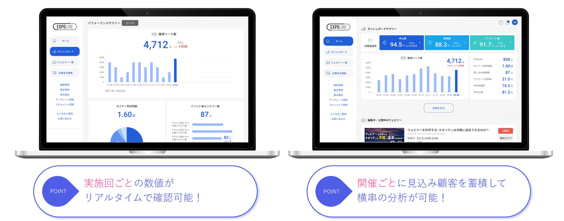 それらを通じて得たお客様の声と親会社である株式会社博展の数多くのイベントノウハウを反映し、“成果の出るウェビナー”を無理なく簡単に続けられる一気通貫型のウェビナーマーケティングツールを制作しました。