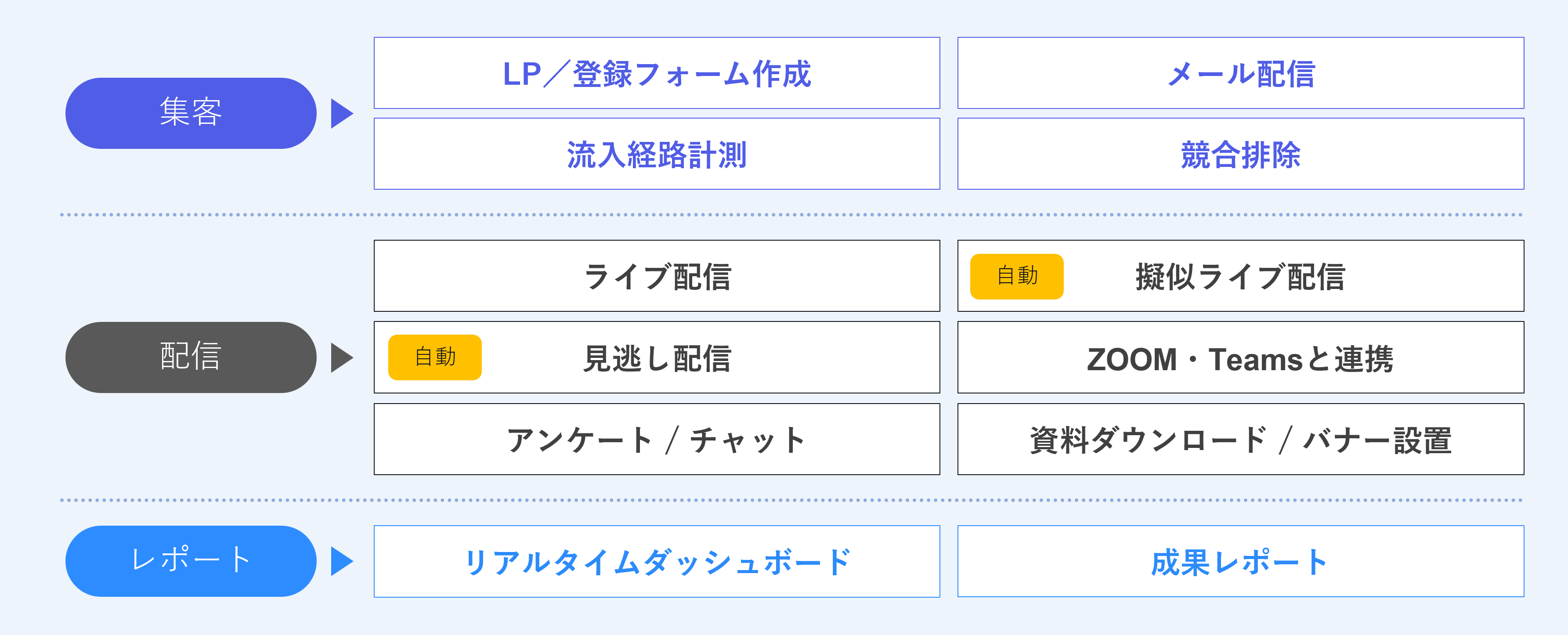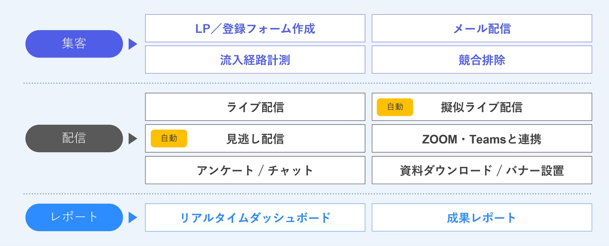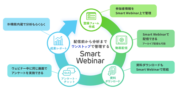 下図のようにウェビナーの開催から成果の分析までワンストップでおこなえるツールとなっております。
