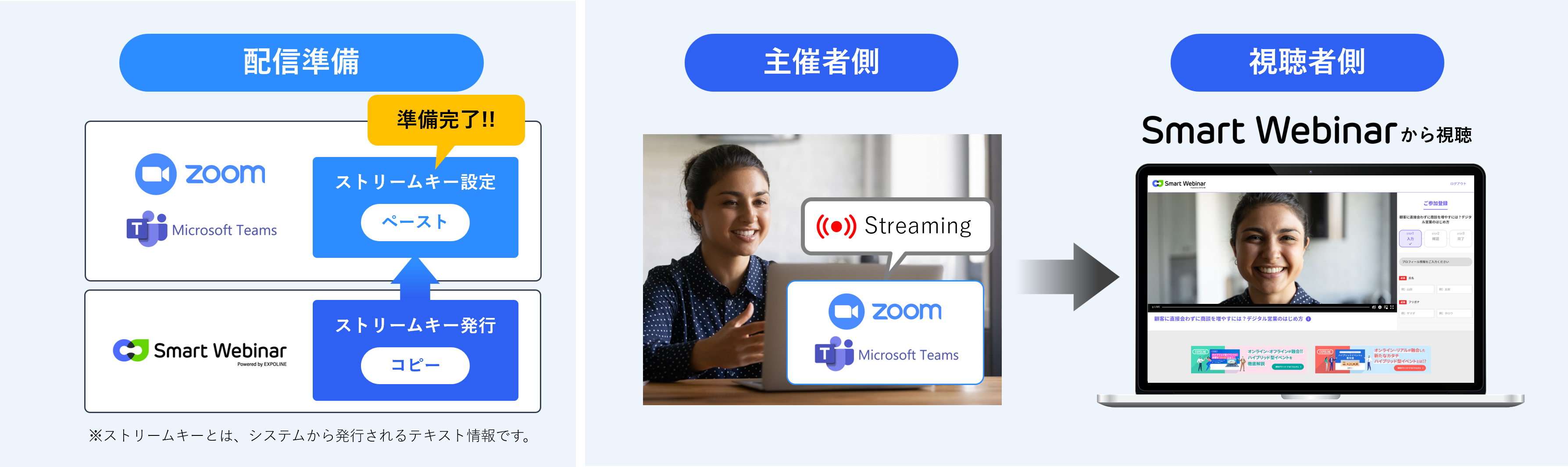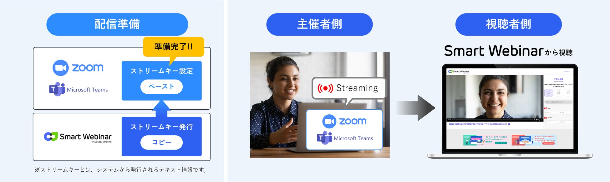 すでにZoomやTeamsなどのweb会議ツールにてウェビナーを実施している方であれば、ストリーミング設定をすることでSmart Webinarで配信がおこなえます。使い慣れた配信ツールを使って簡単かつ手軽に成果の見えるウェビナーが実施できます。