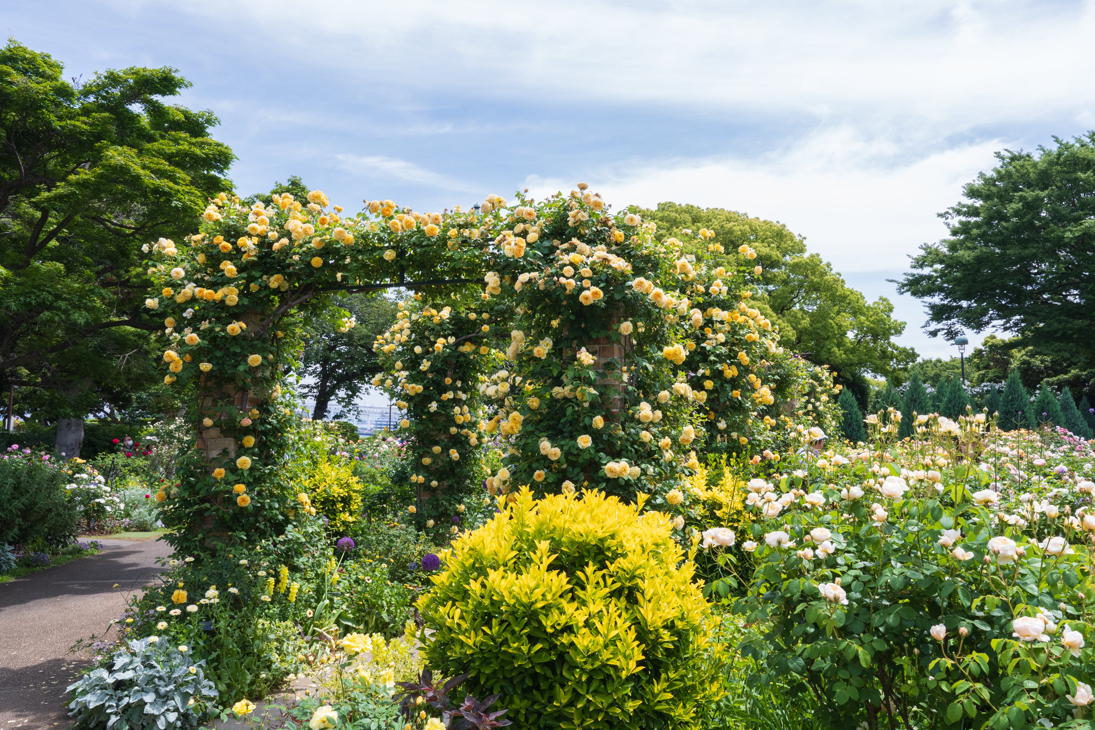 約2,200品種・2,800株のバラが見頃を迎え、約50メートルにおよぶローズ・トンネルが来園者を迎えます。