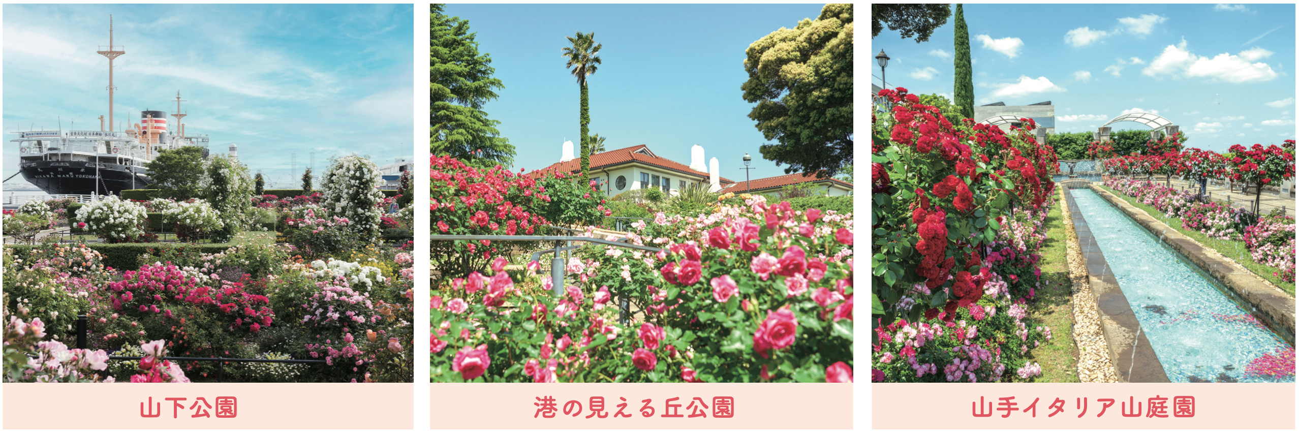 開催場所: 山下公園、港の見える丘公園、山手イタリア山庭園、アメリカ山公園、横浜イングリッシュガーデン、八景島丘の広場バラ園 ほか市内各所