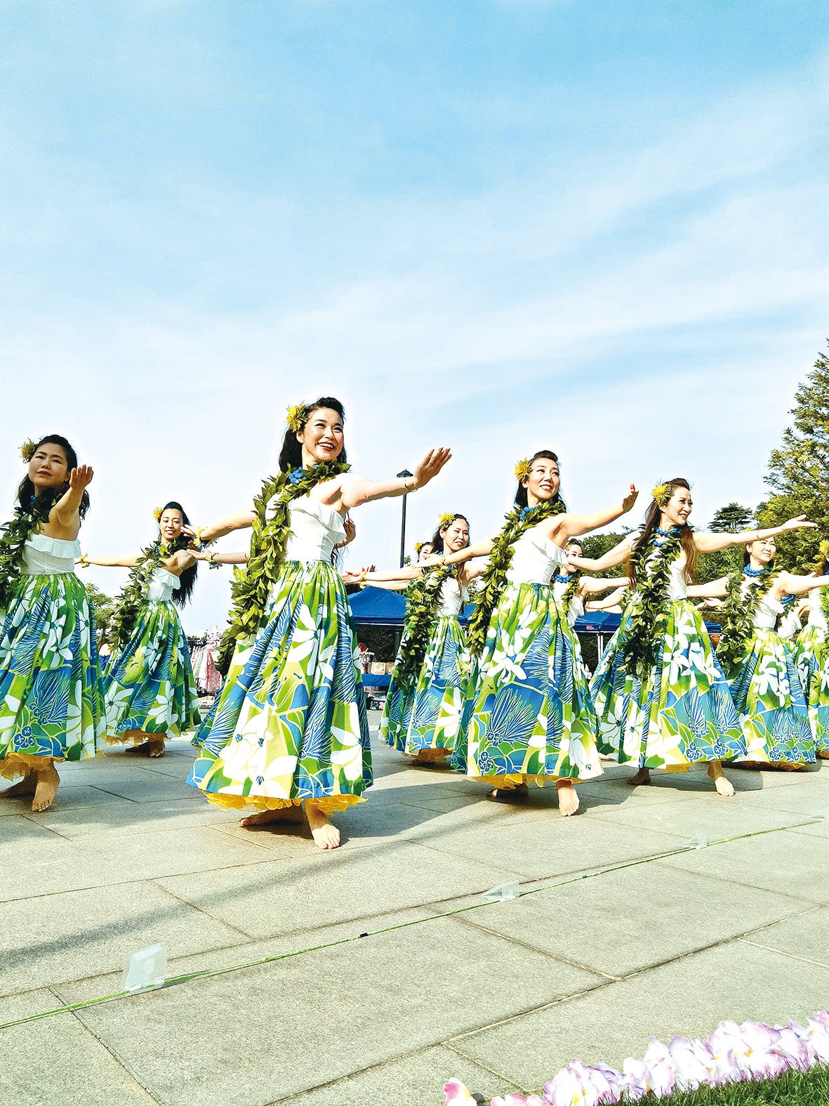 色鮮やかな花と緑に囲まれた公園で、華やかなフラダンスショーを開催します。