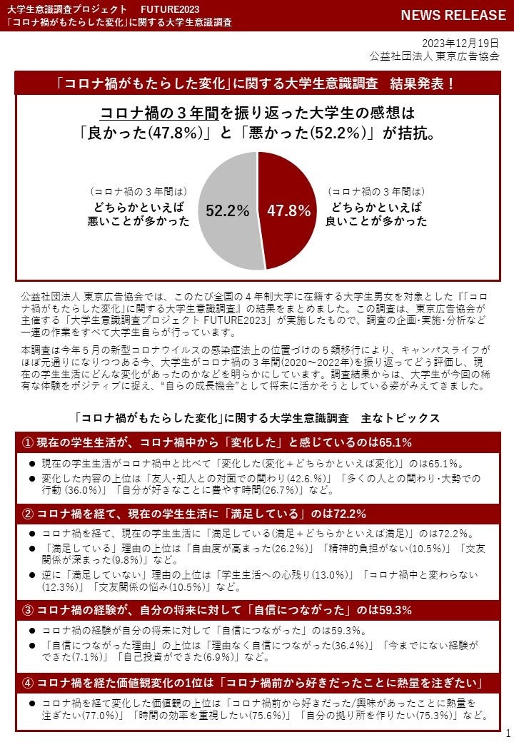 コロナ禍の3年感を振り返った大学生の感想は「良かった(47.8%)」と「悪かった(52.2%)」が拮抗。