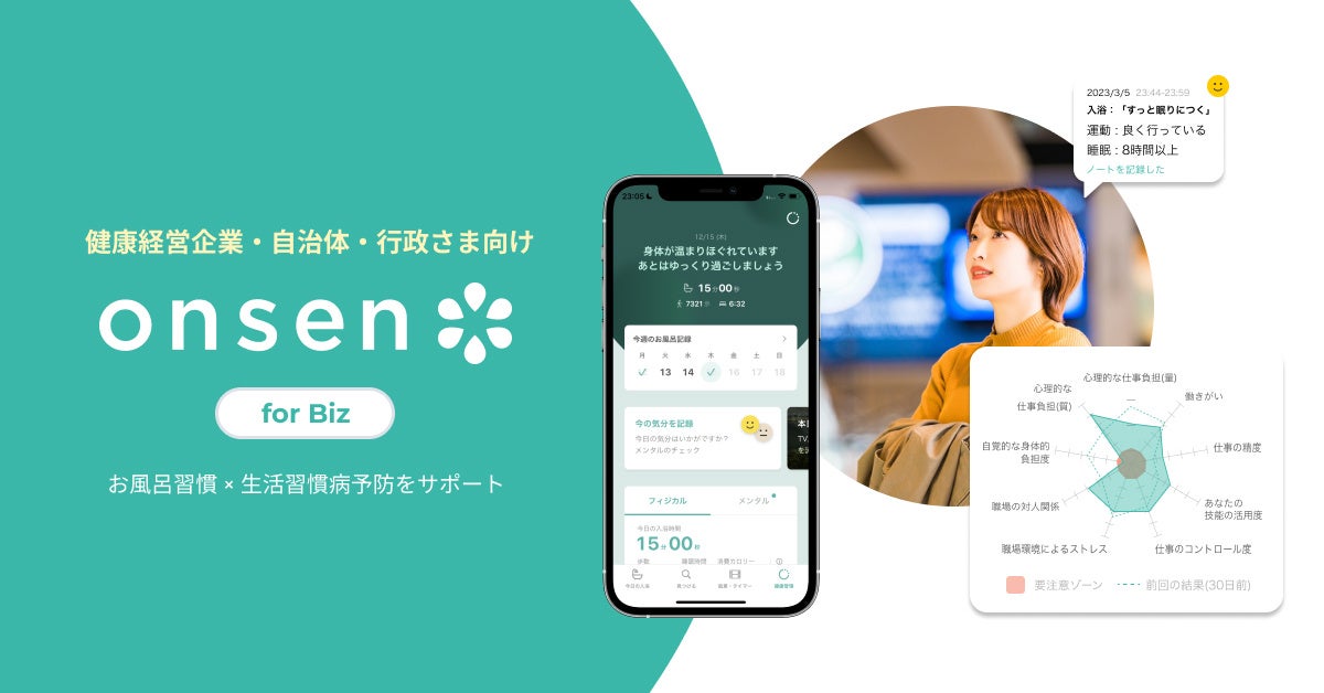 Onsen* for Biz 健康増進ソリューションは、企業や自治体・行政における社員や市民の生活習慣病予防・健康増進・働き方改革やストレスチェックなどの健康経営を支援するお風呂アプリ・入浴剤サービスです。