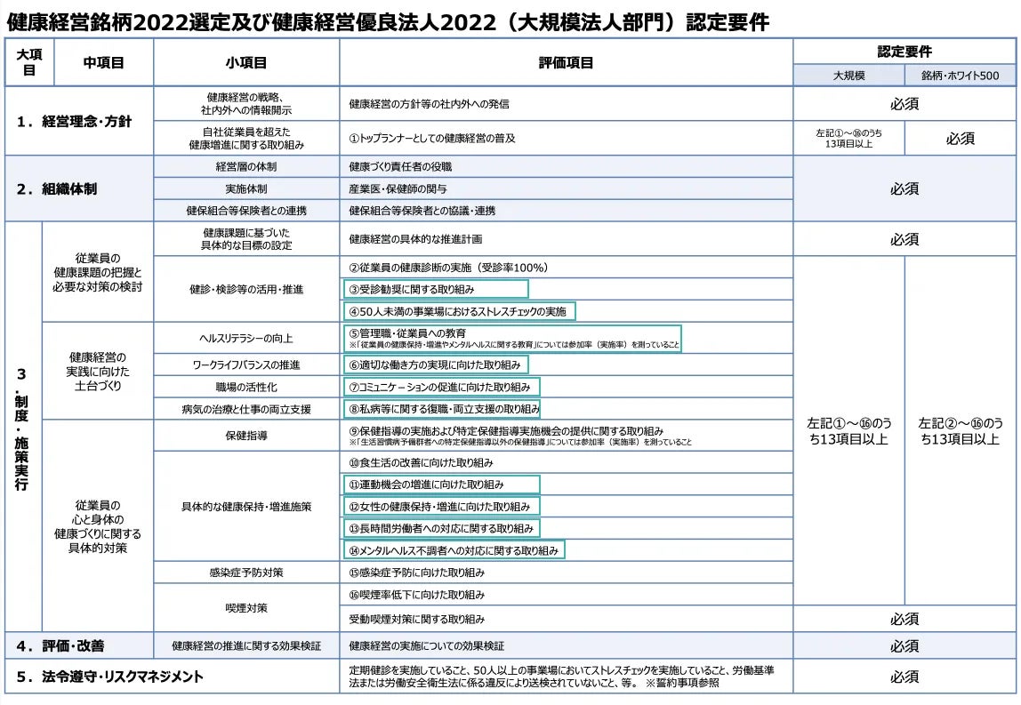 (出典:健康経営優良法人2022(大規模法人部門)認定要件 * サービスの導入により本認定を保証するものではありません。)