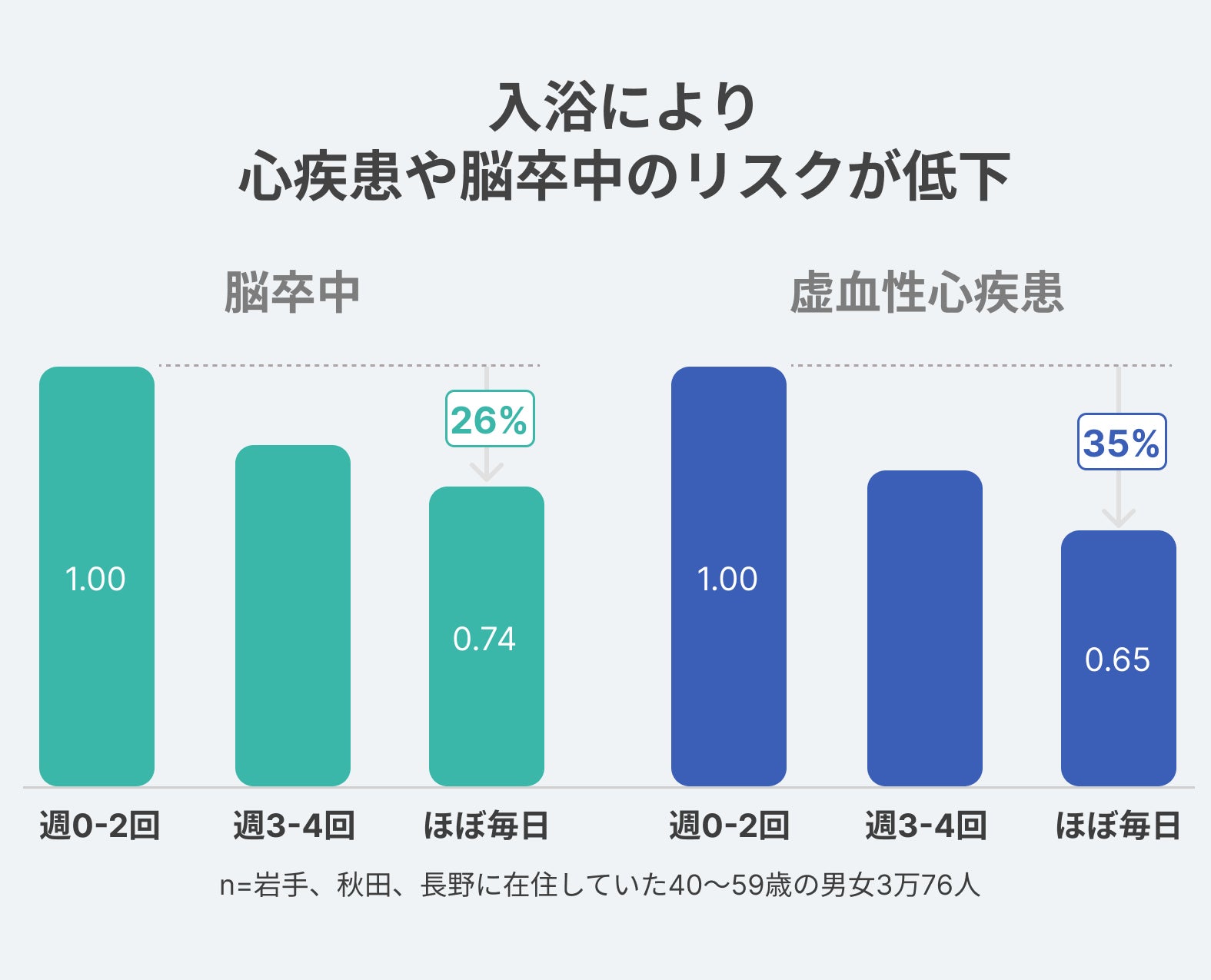 毎日湯船に浸かる人は、湯船に浸かる頻度が週2回以下の人よりも虚血性心疾患発症リスクが35%、脳卒中の発症リスクは26%低下しました。(*2) 別の研究では、毎日湯船に浸かって入浴する高齢者は、週2回以下の高齢者と比べ要介護認定のリスクが約3割減少したとする研究もあります。(*3)