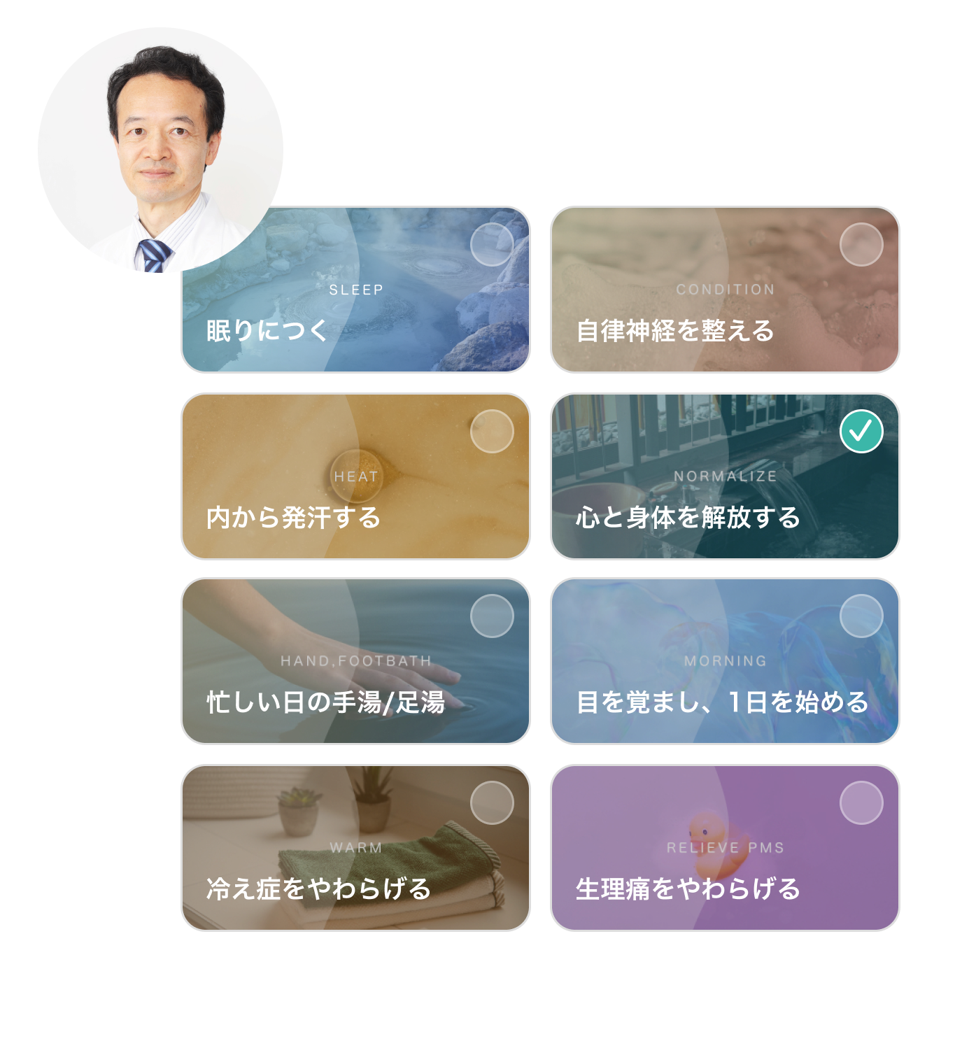 それぞれのレシピは医師の監修を受けており、おすすめの入浴時間や温度、再生されるボイスに従って入浴を行うことで、誰でも簡単に、アプリに身を任せて日常的なリラックスをすることができます。