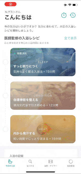 アプリ内では、「ぐっすり眠りたい」「生活リズムの崩れにより自律神経が乱れている」「リラックスしたい」「おウチ時間でも、汗をかきたい」「女性の悩みを解決したい」など日常生活のお悩みを解決する、"入浴レシピ”と呼ばれるコースを実践することができます。