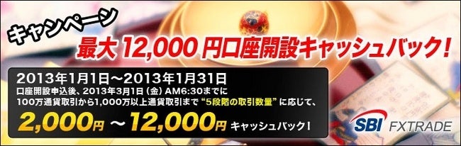 SBI FXトレードが提供する外国為替証拠金取引「SBI FXTRADE」は、2013年1月1日(火)より、最大12,000円の新規口座開設キャッシュバックキャンペーンを実施いたしますのでお知らせいたします。