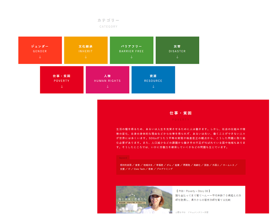 ポータルサイトでは、各社会課題の基礎情報を紹介しているほか、「LGBTQ」「異常気象」などキーワードから関心のあるドキュメンタリー作品を選ぶことができます。