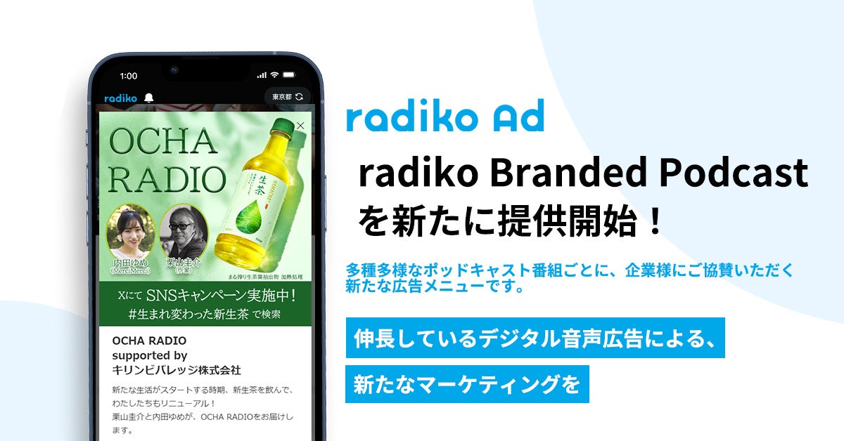 ラジコのターゲティング音声広告「radiko Ad」が、新メニュー『radiko Branded Podcast』の提供を開始。第一弾のご協賛にキリン 生茶が決定!