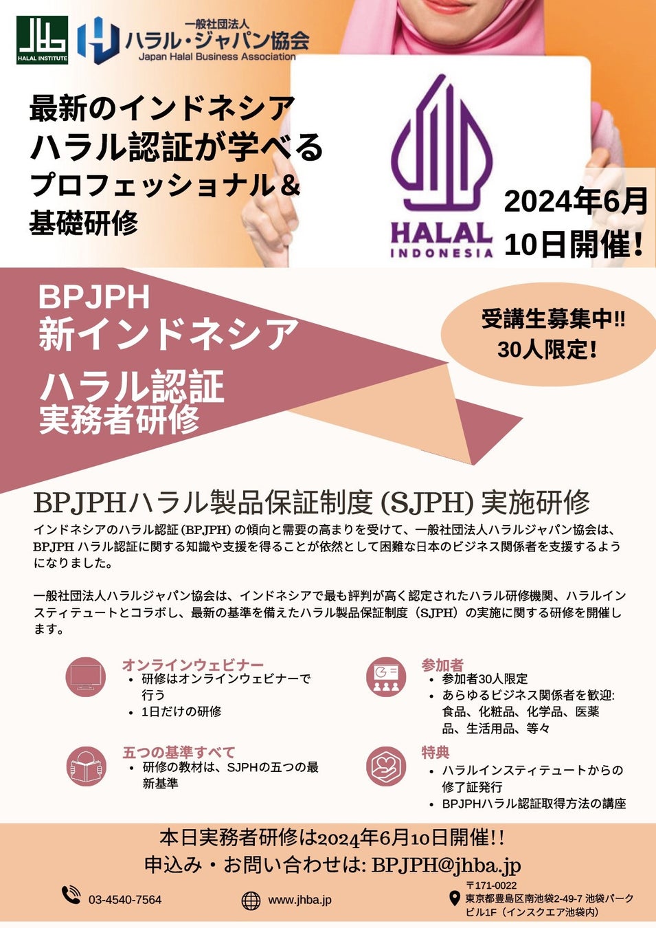 一般社団法人ハラルジャパン協会とHalal Institute:日本企業向けBPJPHハラル製品保証制度研修連携プロジェクトを2024年4月からスタートしました。まずは最新のインドネシアハラル認証が学べるプロフェッショナル&基礎研修「BPJPH新インドネシアハラル認証実務者研修」を2024年6月10日オンラインで開催します。