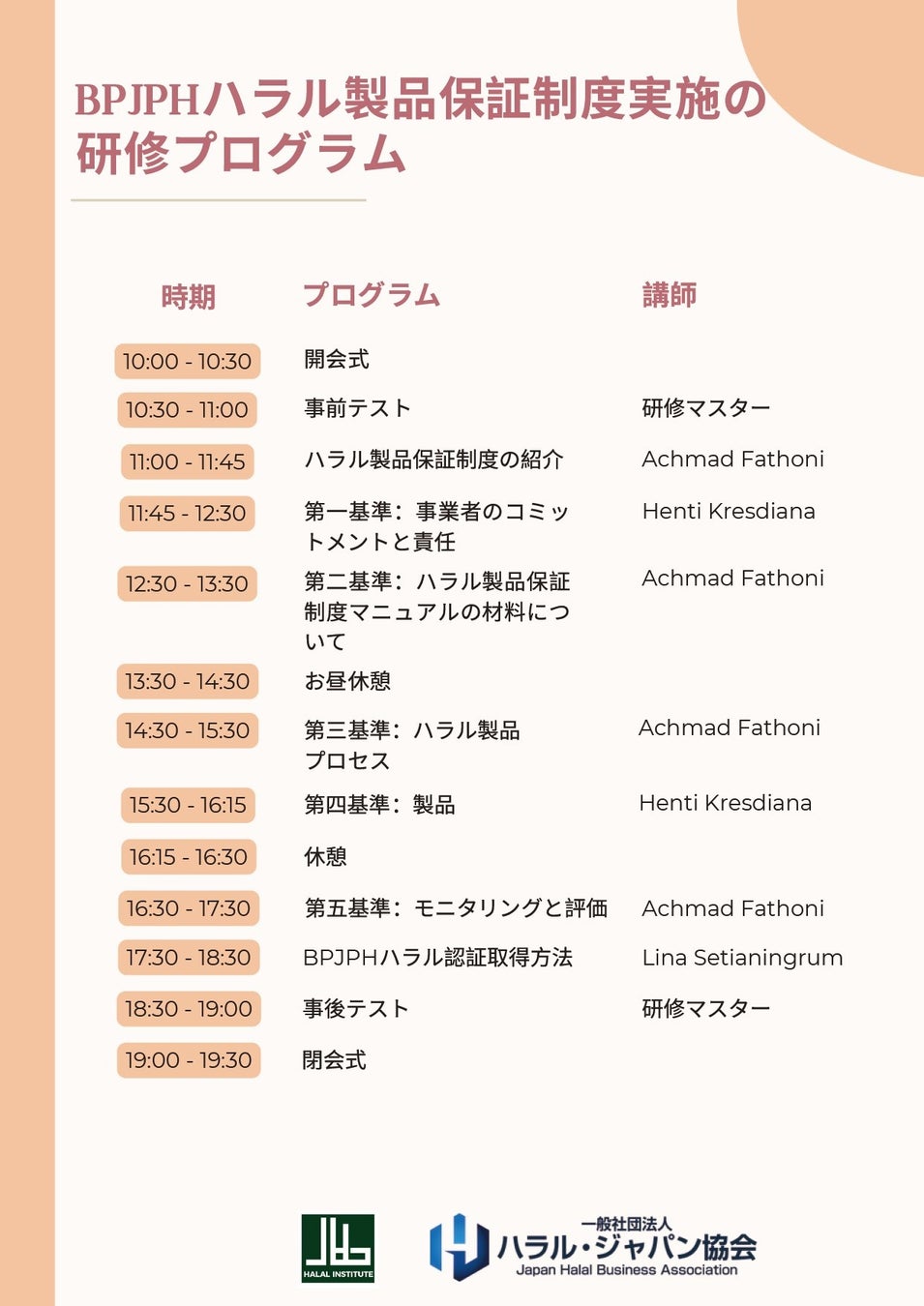ハラル・ジャパン協会からはBPJPHコンサルタントが参加し、BPJPHハラル認証取得方法の講座も学べるのでまさに基礎から実務者まで学ぶことができる研修プログラムです。今回は30人限定で受講生募集致します。※ハラルインスティテュートからの修了証発行