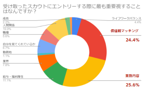 弊社が2023卒向けに実施したアンケートでは、50%の学生が企業からのスカウトにエントリーをする際に【価値観マッチング】【業務内容】を選択しており、「自身のやりたいこと・関心のあること」を重視していることが考えられます。近年のインターンシップ参加増加傾向からも、「働いてから自身は何をできるのか?」を意識していることがわかります。