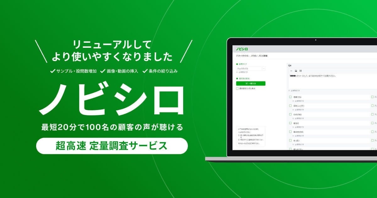 株式会社モニタス(本社:東京都港区、代表取締役社長:林 秀紀、以下「モニタス」)は、ノバセル株式会社(本社:東京都品川区、代表取締役社長:田部正樹、以下「ノバセル」)との共同事業として運営する超高速定量調査サービス「ノビシロ」をリニューアルしたことをお知らせします。