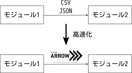 大容量のストレージ・大量のコンピューターリソースを活用することが可能になった現在では、従来は現実的でなかった大量データを処理できるようになりました。現代のデータ処理システムは複数のデータ処理プロダクトを連携して構築されており、データ量の多い環境においては各モジュール間でのデータ交換を効率化することが必須です。この効率的なデータ交換のために設計されたデータフォーマットが「Apache Arrow」です。たとえば、従来はCSVやJSONを使っていたところをApache Arrowを使うようにすればデータ交換処理に必要なコンピューターリソースは非常に小さくなり、本来のデータ処理にコンピューターリソースを投入できます。