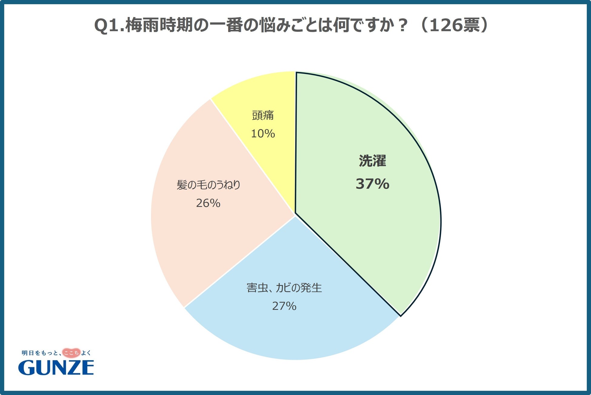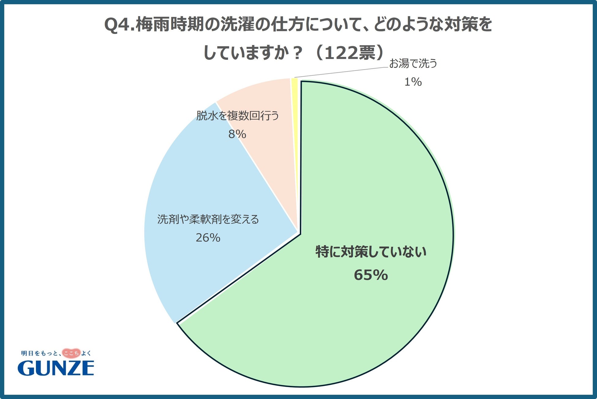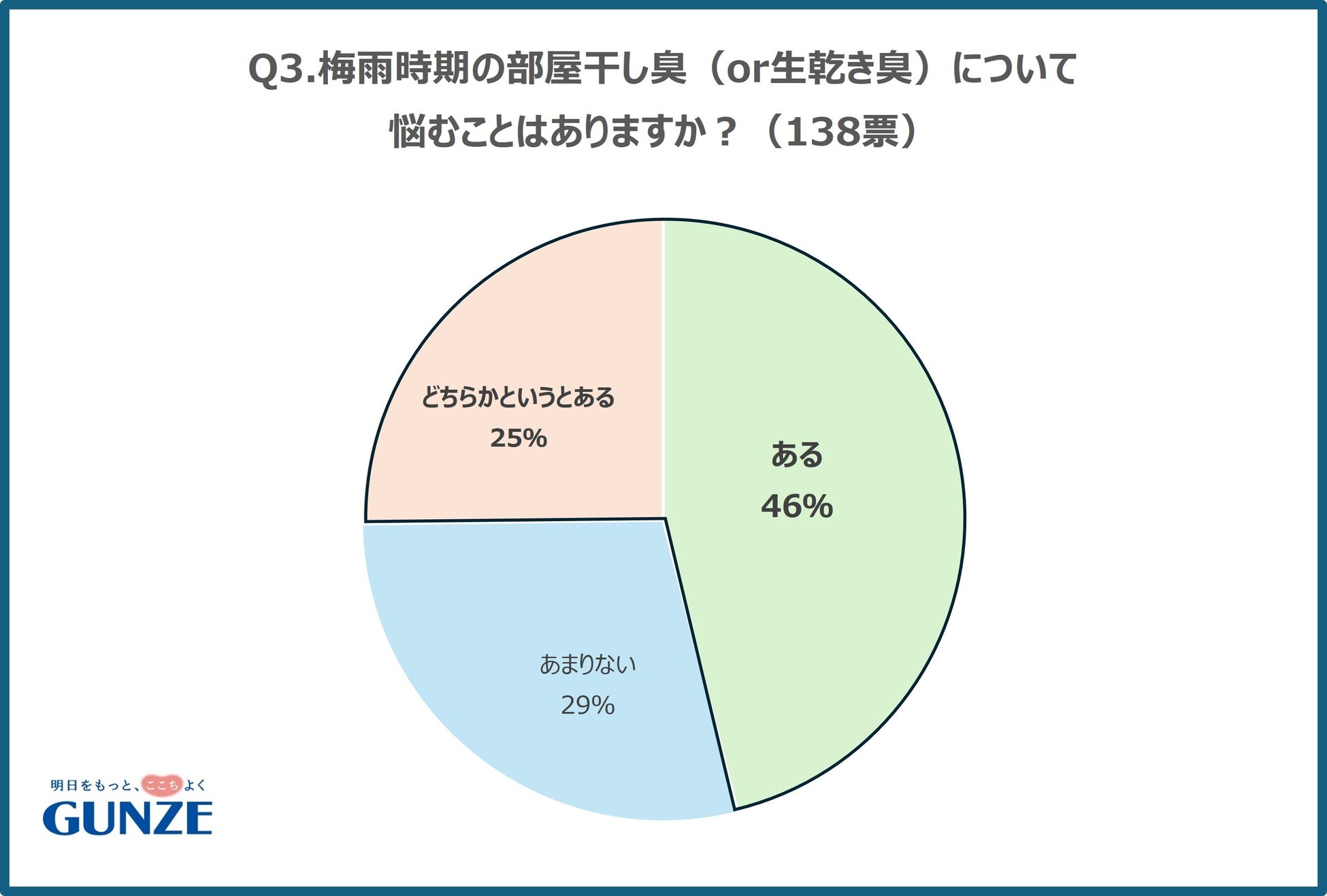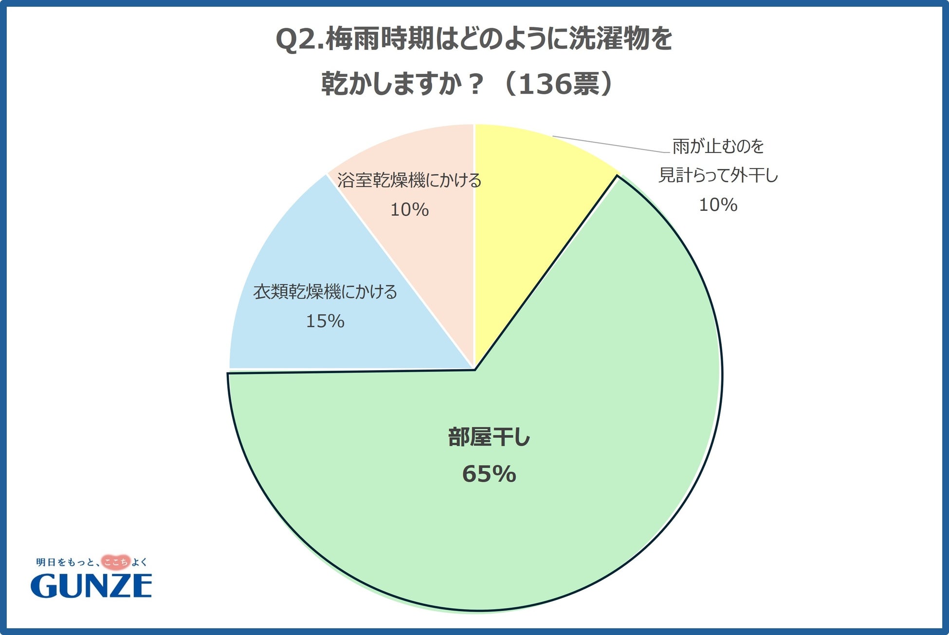 グンゼの公式Xを使用し、梅雨時期についてのアンケート調査を行いました。梅雨時期の悩みごととして、湿度が高いことで、「髪の毛のうねり」や「害虫・カビの発生」「頭痛」といったお悩みがありますが、「洗濯」が一位となりました。梅雨時期の洗濯物の乾かし方としては、部屋干しや衣類乾燥機にかけるなど、外干し以外が90%という結果でした。部屋干しのニオイについて悩んでいる人は71%いるものの、特に対策はしていない人が65%という結果になりました。