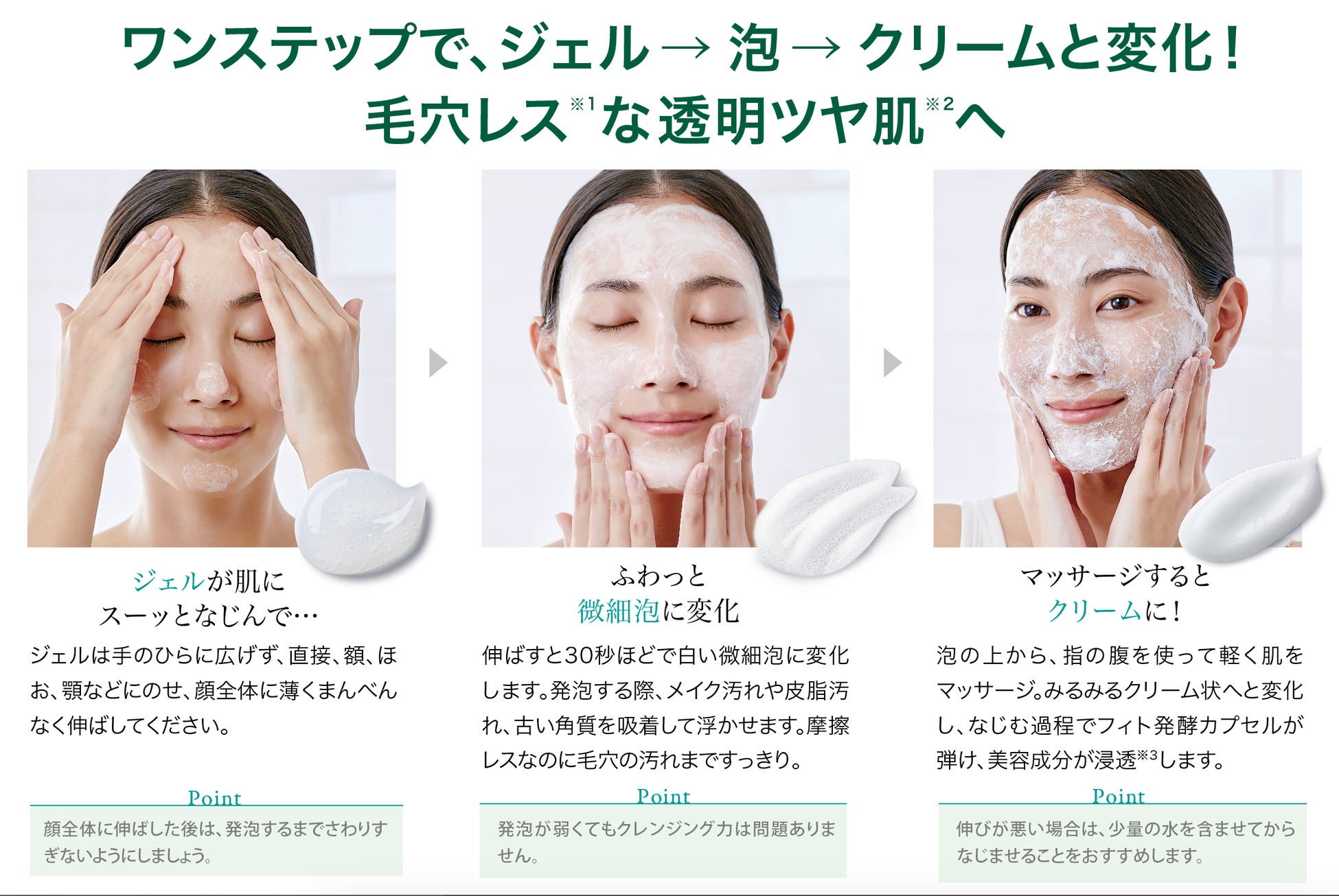 フィト発酵カプセル(※2)配合のジェルが発泡し微細泡へ。W酵素とフィトセルロース(※3)がメイク汚れや古い角質をオフし、オリジナル処方のハーバルエッセンスですこやかな肌へと洗い上げます。