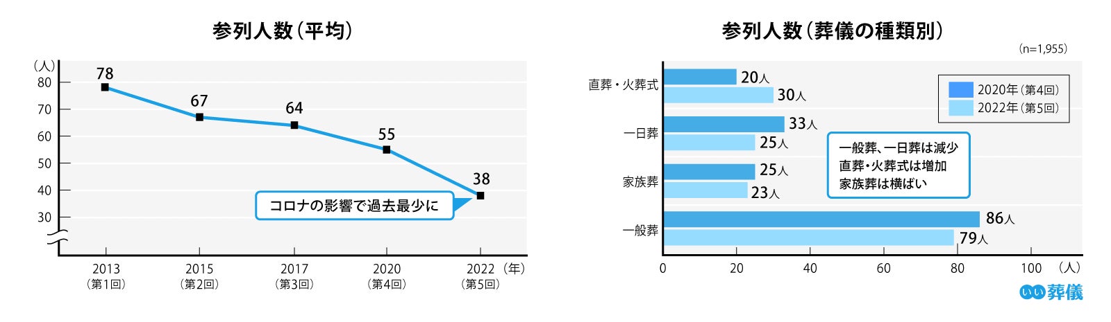― 葬儀の種類別参列人数は、一般葬、一日葬は減少、直葬・火葬式は増加、家族葬は横ばい