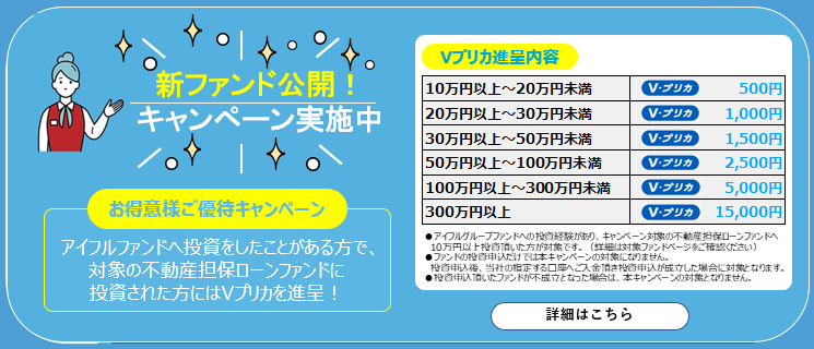 新ファンド公開に合わせ、『お得意様キャンペーン』と称し、アイフルファンドに投資したことがある方、かつ対象の不動産担保ローンファンドに投資いただいた方に、投資金額に応じ最大15,000円分のVプリカを進呈いたします。