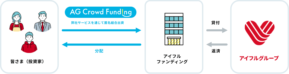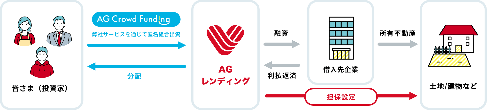 投資家の皆様が出資した資金を貸金業者であるAGレンディング株式会社が出資対象事業として事業資金を必要とする企業に対し、不動産を担保とした貸付事業を行います。万一、貸倒や遅延が発生した場合は、担保である不動産を処分し回収します。