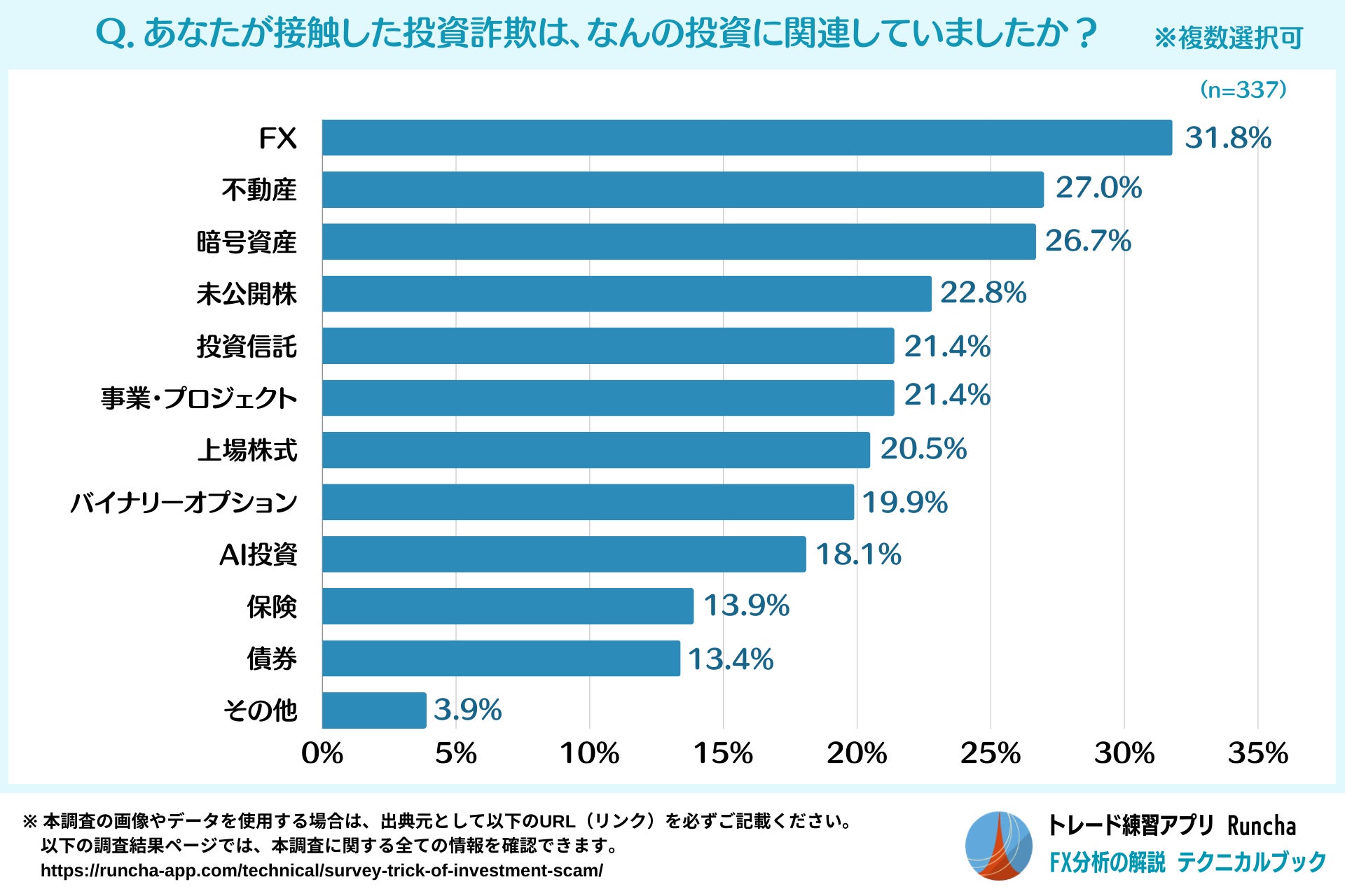 ・過去1年間の投資詐欺で最も利用されているのは「FX」で、「不動産」と「暗号資産」がこれに続く