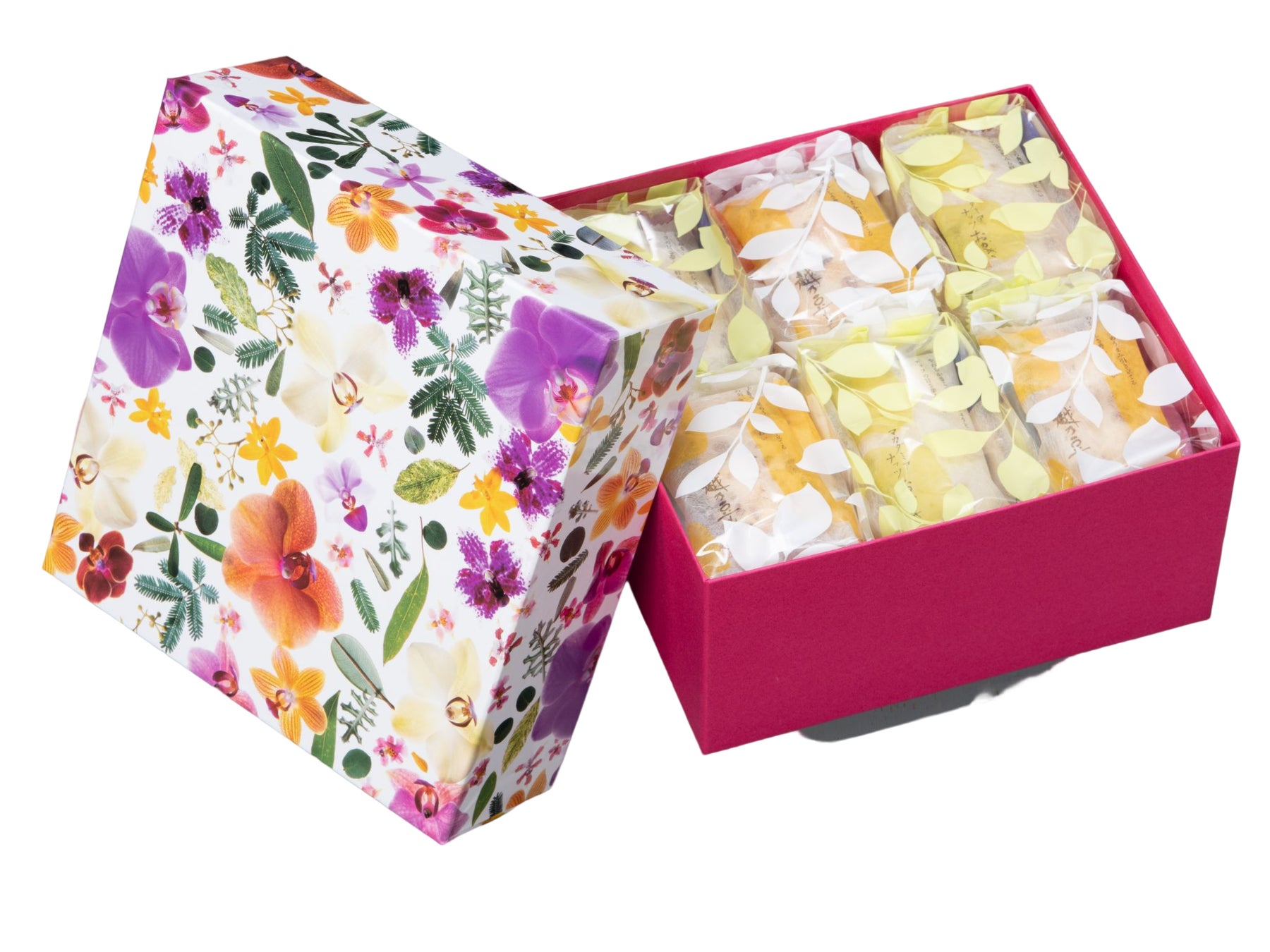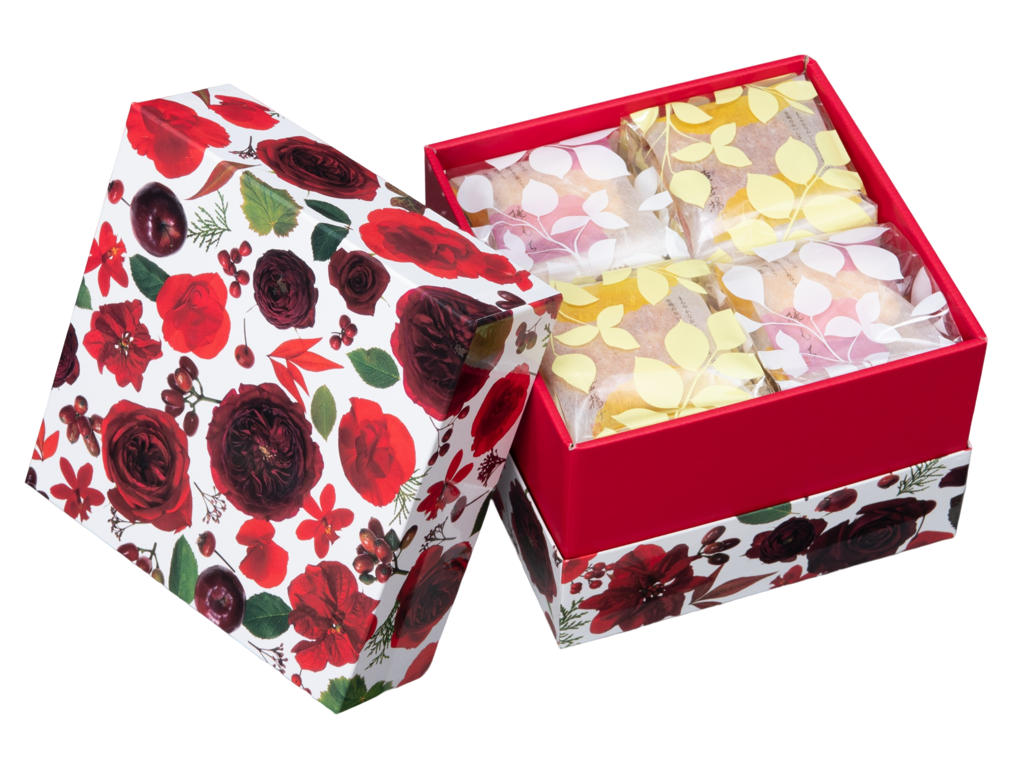 弊本舗のなかで「贈り物」としてお使いいただくことの多い『花のル・コリ』シリーズは、日本の四季を大切に花文化の魅力を伝えるクリエーター集団KTION(東京都大田区、代表:川崎景太)のデザイナーが手掛けています。春夏秋冬それぞれの旬の花を使ったオリジナルデザインの箱に、弊本舗の春夏秋冬それぞれの季節限定の味を