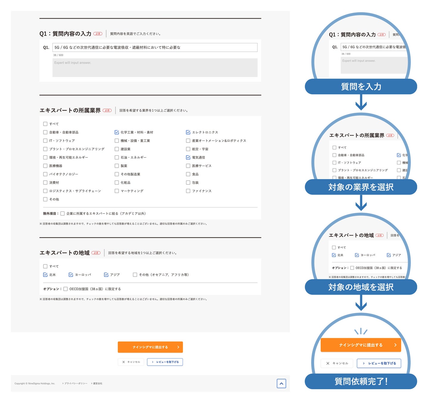 - 世界2万人の技術系エキスパートを対象に、地域・業界等を設定して質問可能