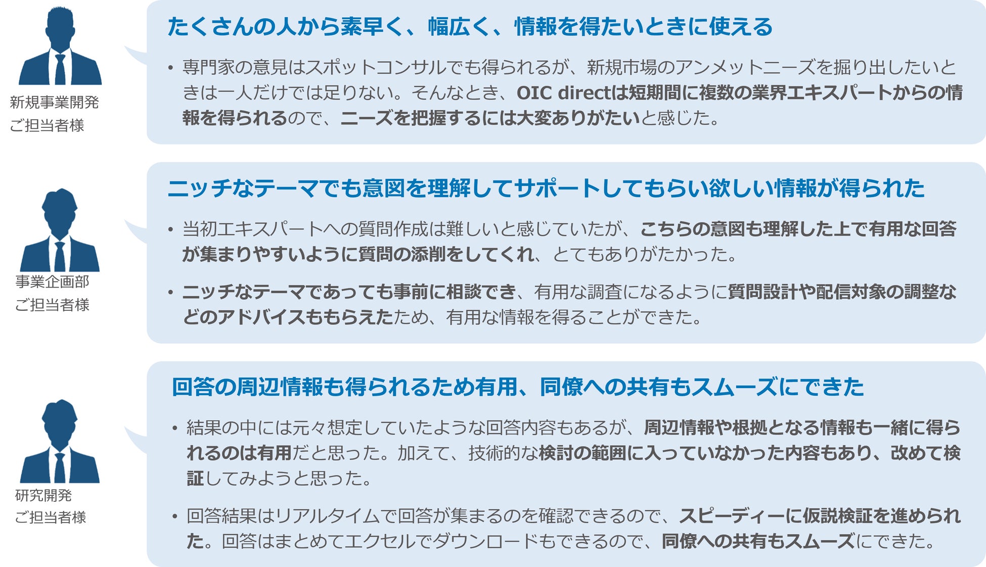 「OIC direct」は、Web検索をするような手軽さで社外のエキスパートに質問&回答が得られ、現場〜経営層までそれぞれの立場で、新規事業開発を推進するために必要な情報収集にご活用いただけるサービスです。