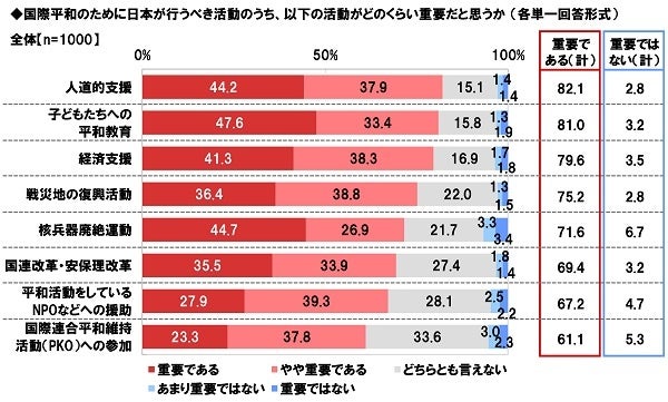 全回答者(1,000名)に、国際平和のために日本が行うべき活動のうち、人道的支援、子どもたちへの平和教育、経済支援、戦災地の復興活動、核兵器廃絶運動、国連改革・安保理改革、平和活動をしているNPOなどへの援助、国際連合平和維持活動(PKO)への参加の8つの分野について、それぞれどのくらい重要だと思うか聞いた。